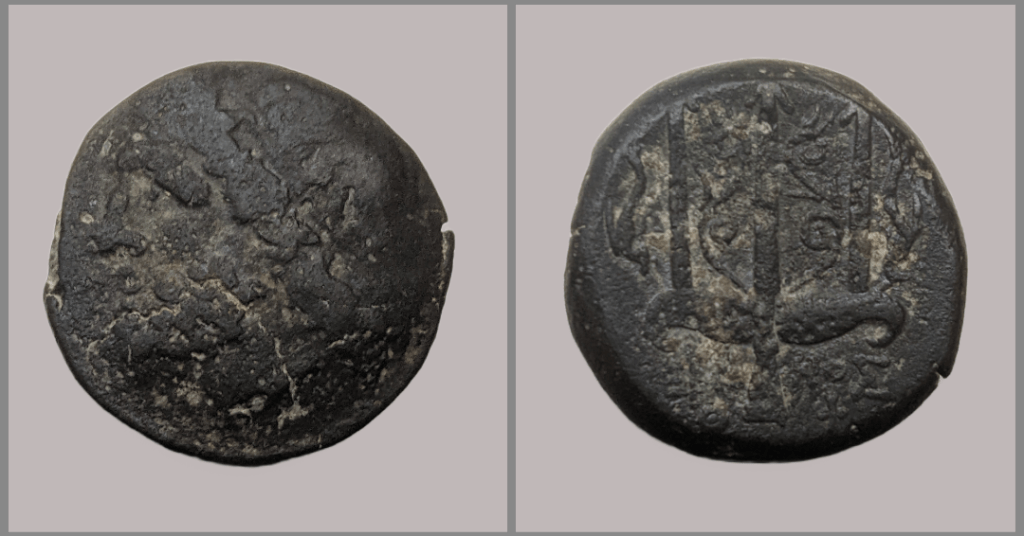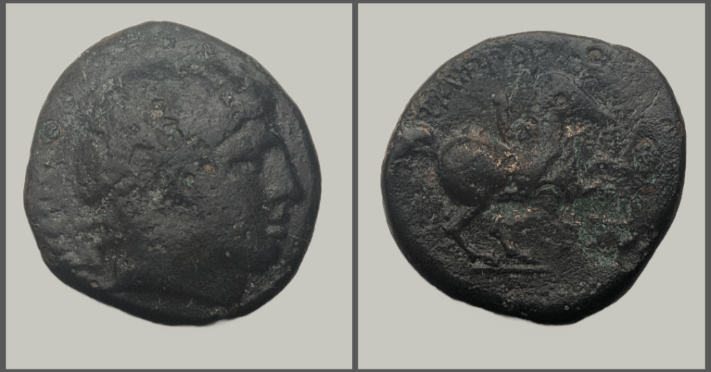Kroll 8, SNG Copenhagen 31A Athenian Owl, 454-404BC, AR Tetradrachm, Helmeted head of Athena to right, Owl standing right, head facing. Behind, olive spray and crescent moon, ΑΘΕ, 16.68g, 23.0mmSear 6696 Philip II, 359-336BC, AE18, Uncertain mint, ΦIΛIΠΠOY, Head of Apollo right bound in tainia, Youth on horseback right, A below, 6.05g, 18.6mmPrice 1364 Alexander the Great, 323-317BC, AR Drachm, Head of beardless Heracles right wearing lion skin headdress, Zeus seated on stool-throne left, eagle on outstretched right hand, sceptre in left hand, Symbol (Left Field): Price Monogram 103 symbol, consists of Α and Π, Symbol (Beneath Throne): snake, Legend: ΑΛΕΞΑΝΔΡΟΥGCV 1223 Hieron II, 275-215BC, AE Litra, Syracuse mint, Diademed head of Poseidon left, within border of dots, Trident head flanked by dolphins; letter or monogram below, ΙΕΡ/ΩΝΟΣ(Hieron), 5.73g, 18.9mm B.M.C. 4.82 16 Alexander II Zebinas, 129-128BC, AE19, Uncertain mint, Diademed head of Alexander II right, within border of dots, BAΣIΛEΩΣ AΛEXANΔΡOY, Dionysos, wearing short chiton and boots, standing left, holding kantharos and thyrsos, date ΔΠΡ downwards in inner left field. 6.58g, 19.4mmGVC 3642 Mithridates VI Eupator, 85-65BC, Bronze Pontus Tetrachalkon, Amisos mint, Gorgoneion on aegis, Nike advancing right, holding wreath and palm branch, ΑΜΙ ΣΟΥ