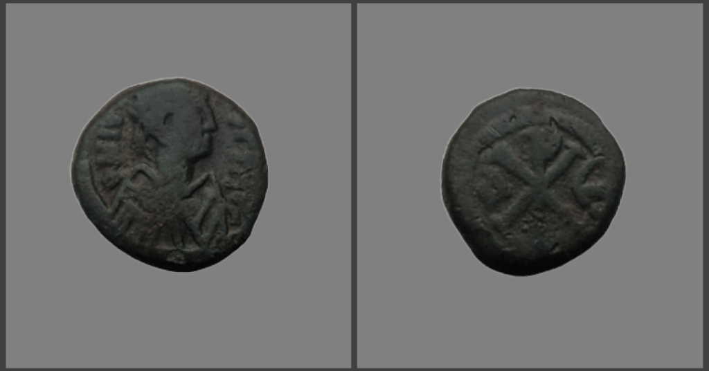 SB 75 Justin I, 512-518AD, Bronze Pentanummium, Constantinople Mint, DN IVSTINVS PP AVG, Large chi-rho, officina letter to left, value letter epsilon (5) to rightSB 62 Justin I, 518-527AD, Bronze AE2, Constantinople Mint, DN IVSTINVS PP AVG, Large M, star left, cross above, star right, CON mint mark belowSB 159 Justinian I, 527-538AD, AE Follis(40 nummi), Constantinople mint, 3rd officina, D N IVSTINIANVS P P AVG, Large M, star to left, cross above and to right, officina letter beneath, CON in exergueSB 199 Justinian I, 527-538AD, AE Follis, Nicomedia mint 2nd officina, Diademed, draped, cuirassed bust right, D N IVSTINIANVS P P AVG, Large M, cross on either side and above, officina letter(B) beneath, NIKM in exergue.SB 224A Justinian I, 527-528AD, AE Half Follis, Antioch mint 3rd officina, Diademed, draped, cuirassed bust right, D N IVSTINIANVS P P AVG, Large K, long cross to left dividing A-N above and T-X bellow, Γ to right, ANTX K Γ, 9.52g, 26.4mmSB 361 MIB 44a Justin II, 574-575AD, AE Half Follis, Constantinople mint 3rd officina, DN IVSTINVS PP AVG, Justin left and Sophia right, seated facing on double-throne, both nimbate, Justin holding cross on globe, Sophia holding sceptre topped by cross, Large K, ANNO to left, cross above, regnal year to right, officina letter below. 7.0g 25.7mmSB 537 MIB 102C Maurice Tiberius, 595-596AD, AE Decanummium, Antioch mint, D N MAV CN P AV, crowned and mantled bust facing, trefoil or \|/ pattern on crown, holding mappa and eagle-tipped sceptre, Large I, cross on top, ANNO to left, regnal year, XIIII, to right, THEUP, 2.66g, 18.0mmSB 644 Phocas, 602-610AD, AE Half Follis, Constantinople mint 4th officina, Overstruck, “PP AVG” visible on obverse, Crowned and mantled bust facing, holding mappa and cross, DM FOCA PERP AVG, Large XX, star above. Mintmark CONΔMIB 83a; DOC 87; SB 671. Phocas, 605-606AD, AE Follis, Antioch mint, O N FOCA NЄ PЄ AV, Phocas on left and Leontia on right, standing facing; he holds a globus cruciger while she holds a cruciform scepter, cross between their heads, Large M, ANNO to left, cross above, V to right, THEUP in exergue, 11.25g 28.4mmBCV 1004 Constans II Pogonatos, 644-645AD, AE Follis(40 nummi), Constantinople Mint, PER CONST, Large M, ANA to left, cross above, III to right, mint mark below, NEOS in exAnonymous A3 Follis Jesus Christ, 1025-1028AD, AE Follis, Constantinople mint, Bust of Christ facing, wearing nimbus cruciger, pallium and colobium, holding ornamented Gospels with both hands, IC to left, XC to right, +ЄMMANOVHΛ, IC XC, Legend in four lines with ornaments above and below, +IhSЧS XRISTЧS bASILЄЧ bASILЄAnonymous A3 Follis Jesus Christ, 1025-1028AD, AE Follis, Constantinople mint, Bust of Christ facing, wearing nimbus cruciger, pallium and colobium, holding ornamented Gospels with both hands, IC to left, XC to right, +ЄMMANOVHΛ, IC XC, Legend in four lines with ornaments above and below, +IhSЧS XRISTЧS bASILЄЧ bASILЄ