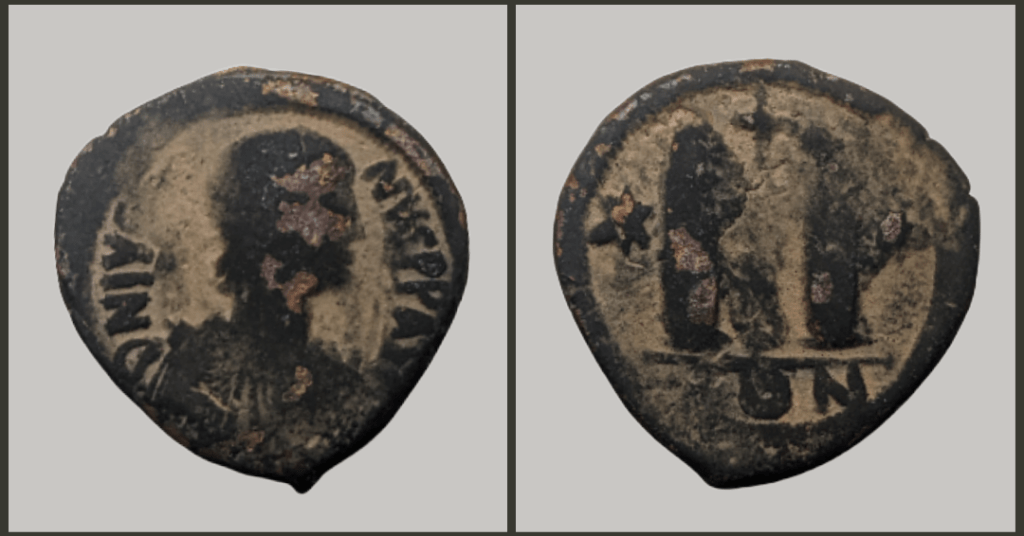 SB 75 Justin I, 512-518AD, Bronze Pentanummium, Constantinople Mint, DN IVSTINVS PP AVG, Large chi-rho, officina letter to left, value letter epsilon (5) to rightSB 62 Justin I, 518-527AD, Bronze AE2, Constantinople Mint, DN IVSTINVS PP AVG, Large M, star left, cross above, star right, CON mint mark belowSB 159 Justinian I, 527-538AD, AE Follis(40 nummi), Constantinople mint, 3rd officina, D N IVSTINIANVS P P AVG, Large M, star to left, cross above and to right, officina letter beneath, CON in exergueSB 199 Justinian I, 527-538AD, AE Follis, Nicomedia mint 2nd officina, Diademed, draped, cuirassed bust right, D N IVSTINIANVS P P AVG, Large M, cross on either side and above, officina letter(B) beneath, NIKM in exergue.SB 224A Justinian I, 527-528AD, AE Half Follis, Antioch mint 3rd officina, Diademed, draped, cuirassed bust right, D N IVSTINIANVS P P AVG, Large K, long cross to left dividing A-N above and T-X bellow, Γ to right, ANTX K Γ, 9.52g, 26.4mmSB 361 MIB 44a Justin II, 574-575AD, AE Half Follis, Constantinople mint 3rd officina, DN IVSTINVS PP AVG, Justin left and Sophia right, seated facing on double-throne, both nimbate, Justin holding cross on globe, Sophia holding sceptre topped by cross, Large K, ANNO to left, cross above, regnal year to right, officina letter below. 7.0g 25.7mmSB 537 MIB 102C Maurice Tiberius, 595-596AD, AE Decanummium, Antioch mint, D N MAV CN P AV, crowned and mantled bust facing, trefoil or \|/ pattern on crown, holding mappa and eagle-tipped sceptre, Large I, cross on top, ANNO to left, regnal year, XIIII, to right, THEUP, 2.66g, 18.0mmSB 644 Phocas, 602-610AD, AE Half Follis, Constantinople mint 4th officina, Overstruck, “PP AVG” visible on obverse, Crowned and mantled bust facing, holding mappa and cross, DM FOCA PERP AVG, Large XX, star above. Mintmark CONΔMIB 83a; DOC 87; SB 671. Phocas, 605-606AD, AE Follis, Antioch mint, O N FOCA NЄ PЄ AV, Phocas on left and Leontia on right, standing facing; he holds a globus cruciger while she holds a cruciform scepter, cross between their heads, Large M, ANNO to left, cross above, V to right, THEUP in exergue, 11.25g 28.4mmBCV 1004 Constans II Pogonatos, 644-645AD, AE Follis(40 nummi), Constantinople Mint, PER CONST, Large M, ANA to left, cross above, III to right, mint mark below, NEOS in exAnonymous A3 Follis Jesus Christ, 1025-1028AD, AE Follis, Constantinople mint, Bust of Christ facing, wearing nimbus cruciger, pallium and colobium, holding ornamented Gospels with both hands, IC to left, XC to right, +ЄMMANOVHΛ, IC XC, Legend in four lines with ornaments above and below, +IhSЧS XRISTЧS bASILЄЧ bASILЄAnonymous A3 Follis Jesus Christ, 1025-1028AD, AE Follis, Constantinople mint, Bust of Christ facing, wearing nimbus cruciger, pallium and colobium, holding ornamented Gospels with both hands, IC to left, XC to right, +ЄMMANOVHΛ, IC XC, Legend in four lines with ornaments above and below, +IhSЧS XRISTЧS bASILЄЧ bASILЄ