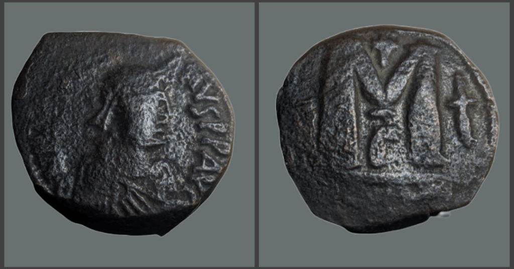 SB 75 Justin I, 512-518AD, Bronze Pentanummium, Constantinople Mint, DN IVSTINVS PP AVG, Large chi-rho, officina letter to left, value letter epsilon (5) to rightSB 62 Justin I, 518-527AD, Bronze AE2, Constantinople Mint, DN IVSTINVS PP AVG, Large M, star left, cross above, star right, CON mint mark belowSB 159 Justinian I, 527-538AD, AE Follis(40 nummi), Constantinople mint, 3rd officina, D N IVSTINIANVS P P AVG, Large M, star to left, cross above and to right, officina letter beneath, CON in exergueSB 199 Justinian I, 527-538AD, AE Follis, Nicomedia mint 2nd officina, Diademed, draped, cuirassed bust right, D N IVSTINIANVS P P AVG, Large M, cross on either side and above, officina letter(B) beneath, NIKM in exergue.SB 224A Justinian I, 527-528AD, AE Half Follis, Antioch mint 3rd officina, Diademed, draped, cuirassed bust right, D N IVSTINIANVS P P AVG, Large K, long cross to left dividing A-N above and T-X bellow, Γ to right, ANTX K Γ, 9.52g, 26.4mmSB 361 MIB 44a Justin II, 574-575AD, AE Half Follis, Constantinople mint 3rd officina, DN IVSTINVS PP AVG, Justin left and Sophia right, seated facing on double-throne, both nimbate, Justin holding cross on globe, Sophia holding sceptre topped by cross, Large K, ANNO to left, cross above, regnal year to right, officina letter below. 7.0g 25.7mmSB 537 MIB 102C Maurice Tiberius, 595-596AD, AE Decanummium, Antioch mint, D N MAV CN P AV, crowned and mantled bust facing, trefoil or \|/ pattern on crown, holding mappa and eagle-tipped sceptre, Large I, cross on top, ANNO to left, regnal year, XIIII, to right, THEUP, 2.66g, 18.0mmSB 644 Phocas, 602-610AD, AE Half Follis, Constantinople mint 4th officina, Overstruck, “PP AVG” visible on obverse, Crowned and mantled bust facing, holding mappa and cross, DM FOCA PERP AVG, Large XX, star above. Mintmark CONΔMIB 83a; DOC 87; SB 671. Phocas, 605-606AD, AE Follis, Antioch mint, O N FOCA NЄ PЄ AV, Phocas on left and Leontia on right, standing facing; he holds a globus cruciger while she holds a cruciform scepter, cross between their heads, Large M, ANNO to left, cross above, V to right, THEUP in exergue, 11.25g 28.4mmBCV 1004 Constans II Pogonatos, 644-645AD, AE Follis(40 nummi), Constantinople Mint, PER CONST, Large M, ANA to left, cross above, III to right, mint mark below, NEOS in exAnonymous A3 Follis Jesus Christ, 1025-1028AD, AE Follis, Constantinople mint, Bust of Christ facing, wearing nimbus cruciger, pallium and colobium, holding ornamented Gospels with both hands, IC to left, XC to right, +ЄMMANOVHΛ, IC XC, Legend in four lines with ornaments above and below, +IhSЧS XRISTЧS bASILЄЧ bASILЄAnonymous A3 Follis Jesus Christ, 1025-1028AD, AE Follis, Constantinople mint, Bust of Christ facing, wearing nimbus cruciger, pallium and colobium, holding ornamented Gospels with both hands, IC to left, XC to right, +ЄMMANOVHΛ, IC XC, Legend in four lines with ornaments above and below, +IhSЧS XRISTЧS bASILЄЧ bASILЄ