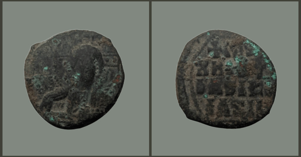 SB 75 Justin I, 512-518AD, Bronze Pentanummium, Constantinople Mint, DN IVSTINVS PP AVG, Large chi-rho, officina letter to left, value letter epsilon (5) to rightSB 62 Justin I, 518-527AD, Bronze AE2, Constantinople Mint, DN IVSTINVS PP AVG, Large M, star left, cross above, star right, CON mint mark belowSB 159 Justinian I, 527-538AD, AE Follis(40 nummi), Constantinople mint, 3rd officina, D N IVSTINIANVS P P AVG, Large M, star to left, cross above and to right, officina letter beneath, CON in exergueSB 199 Justinian I, 527-538AD, AE Follis, Nicomedia mint 2nd officina, Diademed, draped, cuirassed bust right, D N IVSTINIANVS P P AVG, Large M, cross on either side and above, officina letter(B) beneath, NIKM in exergue.SB 224A Justinian I, 527-528AD, AE Half Follis, Antioch mint 3rd officina, Diademed, draped, cuirassed bust right, D N IVSTINIANVS P P AVG, Large K, long cross to left dividing A-N above and T-X bellow, Γ to right, ANTX K Γ, 9.52g, 26.4mmSB 361 MIB 44a Justin II, 574-575AD, AE Half Follis, Constantinople mint 3rd officina, DN IVSTINVS PP AVG, Justin left and Sophia right, seated facing on double-throne, both nimbate, Justin holding cross on globe, Sophia holding sceptre topped by cross, Large K, ANNO to left, cross above, regnal year to right, officina letter below. 7.0g 25.7mmSB 537 MIB 102C Maurice Tiberius, 595-596AD, AE Decanummium, Antioch mint, D N MAV CN P AV, crowned and mantled bust facing, trefoil or \|/ pattern on crown, holding mappa and eagle-tipped sceptre, Large I, cross on top, ANNO to left, regnal year, XIIII, to right, THEUP, 2.66g, 18.0mmSB 644 Phocas, 602-610AD, AE Half Follis, Constantinople mint 4th officina, Overstruck, “PP AVG” visible on obverse, Crowned and mantled bust facing, holding mappa and cross, DM FOCA PERP AVG, Large XX, star above. Mintmark CONΔMIB 83a; DOC 87; SB 671. Phocas, 605-606AD, AE Follis, Antioch mint, O N FOCA NЄ PЄ AV, Phocas on left and Leontia on right, standing facing; he holds a globus cruciger while she holds a cruciform scepter, cross between their heads, Large M, ANNO to left, cross above, V to right, THEUP in exergue, 11.25g 28.4mmBCV 1004 Constans II Pogonatos, 644-645AD, AE Follis(40 nummi), Constantinople Mint, PER CONST, Large M, ANA to left, cross above, III to right, mint mark below, NEOS in exAnonymous A3 Follis Jesus Christ, 1025-1028AD, AE Follis, Constantinople mint, Bust of Christ facing, wearing nimbus cruciger, pallium and colobium, holding ornamented Gospels with both hands, IC to left, XC to right, +ЄMMANOVHΛ, IC XC, Legend in four lines with ornaments above and below, +IhSЧS XRISTЧS bASILЄЧ bASILЄAnonymous A3 Follis Jesus Christ, 1025-1028AD, AE Follis, Constantinople mint, Bust of Christ facing, wearing nimbus cruciger, pallium and colobium, holding ornamented Gospels with both hands, IC to left, XC to right, +ЄMMANOVHΛ, IC XC, Legend in four lines with ornaments above and below, +IhSЧS XRISTЧS bASILЄЧ bASILЄ