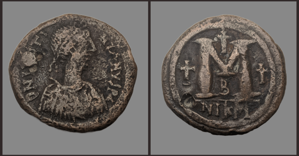 SB 75 Justin I, 512-518AD, Bronze Pentanummium, Constantinople Mint, DN IVSTINVS PP AVG, Large chi-rho, officina letter to left, value letter epsilon (5) to rightSB 62 Justin I, 518-527AD, Bronze AE2, Constantinople Mint, DN IVSTINVS PP AVG, Large M, star left, cross above, star right, CON mint mark belowSB 159 Justinian I, 527-538AD, AE Follis(40 nummi), Constantinople mint, 3rd officina, D N IVSTINIANVS P P AVG, Large M, star to left, cross above and to right, officina letter beneath, CON in exergueSB 199 Justinian I, 527-538AD, AE Follis, Nicomedia mint 2nd officina, Diademed, draped, cuirassed bust right, D N IVSTINIANVS P P AVG, Large M, cross on either side and above, officina letter(B) beneath, NIKM in exergue.SB 224A Justinian I, 527-528AD, AE Half Follis, Antioch mint 3rd officina, Diademed, draped, cuirassed bust right, D N IVSTINIANVS P P AVG, Large K, long cross to left dividing A-N above and T-X bellow, Γ to right, ANTX K Γ, 9.52g, 26.4mmSB 361 MIB 44a Justin II, 574-575AD, AE Half Follis, Constantinople mint 3rd officina, DN IVSTINVS PP AVG, Justin left and Sophia right, seated facing on double-throne, both nimbate, Justin holding cross on globe, Sophia holding sceptre topped by cross, Large K, ANNO to left, cross above, regnal year to right, officina letter below. 7.0g 25.7mmSB 537 MIB 102C Maurice Tiberius, 595-596AD, AE Decanummium, Antioch mint, D N MAV CN P AV, crowned and mantled bust facing, trefoil or \|/ pattern on crown, holding mappa and eagle-tipped sceptre, Large I, cross on top, ANNO to left, regnal year, XIIII, to right, THEUP, 2.66g, 18.0mmSB 644 Phocas, 602-610AD, AE Half Follis, Constantinople mint 4th officina, Overstruck, “PP AVG” visible on obverse, Crowned and mantled bust facing, holding mappa and cross, DM FOCA PERP AVG, Large XX, star above. Mintmark CONΔMIB 83a; DOC 87; SB 671. Phocas, 605-606AD, AE Follis, Antioch mint, O N FOCA NЄ PЄ AV, Phocas on left and Leontia on right, standing facing; he holds a globus cruciger while she holds a cruciform scepter, cross between their heads, Large M, ANNO to left, cross above, V to right, THEUP in exergue, 11.25g 28.4mmBCV 1004 Constans II Pogonatos, 644-645AD, AE Follis(40 nummi), Constantinople Mint, PER CONST, Large M, ANA to left, cross above, III to right, mint mark below, NEOS in exAnonymous A3 Follis Jesus Christ, 1025-1028AD, AE Follis, Constantinople mint, Bust of Christ facing, wearing nimbus cruciger, pallium and colobium, holding ornamented Gospels with both hands, IC to left, XC to right, +ЄMMANOVHΛ, IC XC, Legend in four lines with ornaments above and below, +IhSЧS XRISTЧS bASILЄЧ bASILЄAnonymous A3 Follis Jesus Christ, 1025-1028AD, AE Follis, Constantinople mint, Bust of Christ facing, wearing nimbus cruciger, pallium and colobium, holding ornamented Gospels with both hands, IC to left, XC to right, +ЄMMANOVHΛ, IC XC, Legend in four lines with ornaments above and below, +IhSЧS XRISTЧS bASILЄЧ bASILЄ