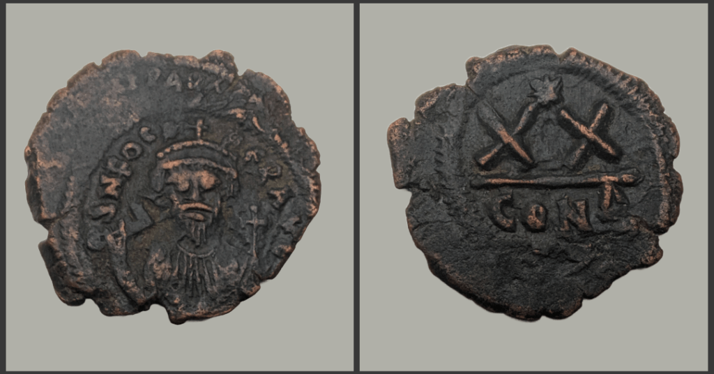SB 75 Justin I, 512-518AD, Bronze Pentanummium, Constantinople Mint, DN IVSTINVS PP AVG, Large chi-rho, officina letter to left, value letter epsilon (5) to rightSB 62 Justin I, 518-527AD, Bronze AE2, Constantinople Mint, DN IVSTINVS PP AVG, Large M, star left, cross above, star right, CON mint mark belowSB 159 Justinian I, 527-538AD, AE Follis(40 nummi), Constantinople mint, 3rd officina, D N IVSTINIANVS P P AVG, Large M, star to left, cross above and to right, officina letter beneath, CON in exergueSB 199 Justinian I, 527-538AD, AE Follis, Nicomedia mint 2nd officina, Diademed, draped, cuirassed bust right, D N IVSTINIANVS P P AVG, Large M, cross on either side and above, officina letter(B) beneath, NIKM in exergue.SB 224A Justinian I, 527-528AD, AE Half Follis, Antioch mint 3rd officina, Diademed, draped, cuirassed bust right, D N IVSTINIANVS P P AVG, Large K, long cross to left dividing A-N above and T-X bellow, Γ to right, ANTX K Γ, 9.52g, 26.4mmSB 361 MIB 44a Justin II, 574-575AD, AE Half Follis, Constantinople mint 3rd officina, DN IVSTINVS PP AVG, Justin left and Sophia right, seated facing on double-throne, both nimbate, Justin holding cross on globe, Sophia holding sceptre topped by cross, Large K, ANNO to left, cross above, regnal year to right, officina letter below. 7.0g 25.7mmSB 537 MIB 102C Maurice Tiberius, 595-596AD, AE Decanummium, Antioch mint, D N MAV CN P AV, crowned and mantled bust facing, trefoil or \|/ pattern on crown, holding mappa and eagle-tipped sceptre, Large I, cross on top, ANNO to left, regnal year, XIIII, to right, THEUP, 2.66g, 18.0mmSB 644 Phocas, 602-610AD, AE Half Follis, Constantinople mint 4th officina, Overstruck, “PP AVG” visible on obverse, Crowned and mantled bust facing, holding mappa and cross, DM FOCA PERP AVG, Large XX, star above. Mintmark CONΔMIB 83a; DOC 87; SB 671. Phocas, 605-606AD, AE Follis, Antioch mint, O N FOCA NЄ PЄ AV, Phocas on left and Leontia on right, standing facing; he holds a globus cruciger while she holds a cruciform scepter, cross between their heads, Large M, ANNO to left, cross above, V to right, THEUP in exergue, 11.25g 28.4mmBCV 1004 Constans II Pogonatos, 644-645AD, AE Follis(40 nummi), Constantinople Mint, PER CONST, Large M, ANA to left, cross above, III to right, mint mark below, NEOS in exAnonymous A3 Follis Jesus Christ, 1025-1028AD, AE Follis, Constantinople mint, Bust of Christ facing, wearing nimbus cruciger, pallium and colobium, holding ornamented Gospels with both hands, IC to left, XC to right, +ЄMMANOVHΛ, IC XC, Legend in four lines with ornaments above and below, +IhSЧS XRISTЧS bASILЄЧ bASILЄAnonymous A3 Follis Jesus Christ, 1025-1028AD, AE Follis, Constantinople mint, Bust of Christ facing, wearing nimbus cruciger, pallium and colobium, holding ornamented Gospels with both hands, IC to left, XC to right, +ЄMMANOVHΛ, IC XC, Legend in four lines with ornaments above and below, +IhSЧS XRISTЧS bASILЄЧ bASILЄ