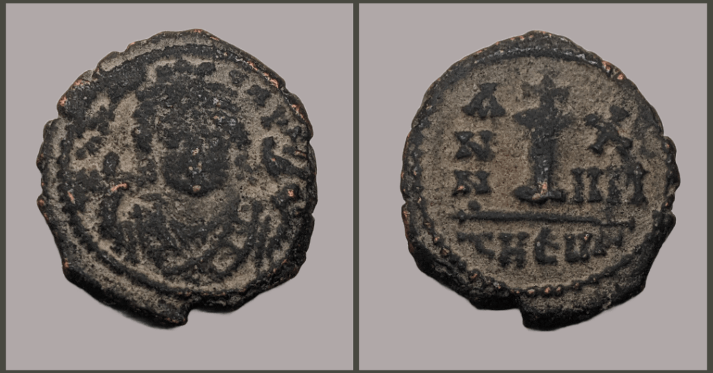SB 75 Justin I, 512-518AD, Bronze Pentanummium, Constantinople Mint, DN IVSTINVS PP AVG, Large chi-rho, officina letter to left, value letter epsilon (5) to rightSB 62 Justin I, 518-527AD, Bronze AE2, Constantinople Mint, DN IVSTINVS PP AVG, Large M, star left, cross above, star right, CON mint mark belowSB 159 Justinian I, 527-538AD, AE Follis(40 nummi), Constantinople mint, 3rd officina, D N IVSTINIANVS P P AVG, Large M, star to left, cross above and to right, officina letter beneath, CON in exergueSB 199 Justinian I, 527-538AD, AE Follis, Nicomedia mint 2nd officina, Diademed, draped, cuirassed bust right, D N IVSTINIANVS P P AVG, Large M, cross on either side and above, officina letter(B) beneath, NIKM in exergue.SB 224A Justinian I, 527-528AD, AE Half Follis, Antioch mint 3rd officina, Diademed, draped, cuirassed bust right, D N IVSTINIANVS P P AVG, Large K, long cross to left dividing A-N above and T-X bellow, Γ to right, ANTX K Γ, 9.52g, 26.4mmSB 361 MIB 44a Justin II, 574-575AD, AE Half Follis, Constantinople mint 3rd officina, DN IVSTINVS PP AVG, Justin left and Sophia right, seated facing on double-throne, both nimbate, Justin holding cross on globe, Sophia holding sceptre topped by cross, Large K, ANNO to left, cross above, regnal year to right, officina letter below. 7.0g 25.7mmSB 537 MIB 102C Maurice Tiberius, 595-596AD, AE Decanummium, Antioch mint, D N MAV CN P AV, crowned and mantled bust facing, trefoil or \|/ pattern on crown, holding mappa and eagle-tipped sceptre, Large I, cross on top, ANNO to left, regnal year, XIIII, to right, THEUP, 2.66g, 18.0mmSB 644 Phocas, 602-610AD, AE Half Follis, Constantinople mint 4th officina, Overstruck, “PP AVG” visible on obverse, Crowned and mantled bust facing, holding mappa and cross, DM FOCA PERP AVG, Large XX, star above. Mintmark CONΔMIB 83a; DOC 87; SB 671. Phocas, 605-606AD, AE Follis, Antioch mint, O N FOCA NЄ PЄ AV, Phocas on left and Leontia on right, standing facing; he holds a globus cruciger while she holds a cruciform scepter, cross between their heads, Large M, ANNO to left, cross above, V to right, THEUP in exergue, 11.25g 28.4mmBCV 1004 Constans II Pogonatos, 644-645AD, AE Follis(40 nummi), Constantinople Mint, PER CONST, Large M, ANA to left, cross above, III to right, mint mark below, NEOS in exAnonymous A3 Follis Jesus Christ, 1025-1028AD, AE Follis, Constantinople mint, Bust of Christ facing, wearing nimbus cruciger, pallium and colobium, holding ornamented Gospels with both hands, IC to left, XC to right, +ЄMMANOVHΛ, IC XC, Legend in four lines with ornaments above and below, +IhSЧS XRISTЧS bASILЄЧ bASILЄAnonymous A3 Follis Jesus Christ, 1025-1028AD, AE Follis, Constantinople mint, Bust of Christ facing, wearing nimbus cruciger, pallium and colobium, holding ornamented Gospels with both hands, IC to left, XC to right, +ЄMMANOVHΛ, IC XC, Legend in four lines with ornaments above and below, +IhSЧS XRISTЧS bASILЄЧ bASILЄ