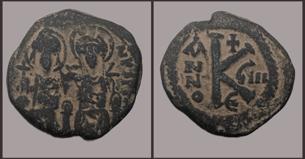 SB 75 Justin I, 512-518AD, Bronze Pentanummium, Constantinople Mint, DN IVSTINVS PP AVG, Large chi-rho, officina letter to left, value letter epsilon (5) to rightSB 62 Justin I, 518-527AD, Bronze AE2, Constantinople Mint, DN IVSTINVS PP AVG, Large M, star left, cross above, star right, CON mint mark belowSB 159 Justinian I, 527-538AD, AE Follis(40 nummi), Constantinople mint, 3rd officina, D N IVSTINIANVS P P AVG, Large M, star to left, cross above and to right, officina letter beneath, CON in exergueSB 199 Justinian I, 527-538AD, AE Follis, Nicomedia mint 2nd officina, Diademed, draped, cuirassed bust right, D N IVSTINIANVS P P AVG, Large M, cross on either side and above, officina letter(B) beneath, NIKM in exergue.SB 224A Justinian I, 527-528AD, AE Half Follis, Antioch mint 3rd officina, Diademed, draped, cuirassed bust right, D N IVSTINIANVS P P AVG, Large K, long cross to left dividing A-N above and T-X bellow, Γ to right, ANTX K Γ, 9.52g, 26.4mmSB 361 MIB 44a Justin II, 574-575AD, AE Half Follis, Constantinople mint 3rd officina, DN IVSTINVS PP AVG, Justin left and Sophia right, seated facing on double-throne, both nimbate, Justin holding cross on globe, Sophia holding sceptre topped by cross, Large K, ANNO to left, cross above, regnal year to right, officina letter below. 7.0g 25.7mmSB 537 MIB 102C Maurice Tiberius, 595-596AD, AE Decanummium, Antioch mint, D N MAV CN P AV, crowned and mantled bust facing, trefoil or \|/ pattern on crown, holding mappa and eagle-tipped sceptre, Large I, cross on top, ANNO to left, regnal year, XIIII, to right, THEUP, 2.66g, 18.0mmSB 644 Phocas, 602-610AD, AE Half Follis, Constantinople mint 4th officina, Overstruck, “PP AVG” visible on obverse, Crowned and mantled bust facing, holding mappa and cross, DM FOCA PERP AVG, Large XX, star above. Mintmark CONΔMIB 83a; DOC 87; SB 671. Phocas, 605-606AD, AE Follis, Antioch mint, O N FOCA NЄ PЄ AV, Phocas on left and Leontia on right, standing facing; he holds a globus cruciger while she holds a cruciform scepter, cross between their heads, Large M, ANNO to left, cross above, V to right, THEUP in exergue, 11.25g 28.4mmBCV 1004 Constans II Pogonatos, 644-645AD, AE Follis(40 nummi), Constantinople Mint, PER CONST, Large M, ANA to left, cross above, III to right, mint mark below, NEOS in exAnonymous A3 Follis Jesus Christ, 1025-1028AD, AE Follis, Constantinople mint, Bust of Christ facing, wearing nimbus cruciger, pallium and colobium, holding ornamented Gospels with both hands, IC to left, XC to right, +ЄMMANOVHΛ, IC XC, Legend in four lines with ornaments above and below, +IhSЧS XRISTЧS bASILЄЧ bASILЄAnonymous A3 Follis Jesus Christ, 1025-1028AD, AE Follis, Constantinople mint, Bust of Christ facing, wearing nimbus cruciger, pallium and colobium, holding ornamented Gospels with both hands, IC to left, XC to right, +ЄMMANOVHΛ, IC XC, Legend in four lines with ornaments above and below, +IhSЧS XRISTЧS bASILЄЧ bASILЄ