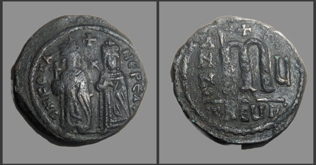 SB 75 Justin I, 512-518AD, Bronze Pentanummium, Constantinople Mint, DN IVSTINVS PP AVG, Large chi-rho, officina letter to left, value letter epsilon (5) to rightSB 62 Justin I, 518-527AD, Bronze AE2, Constantinople Mint, DN IVSTINVS PP AVG, Large M, star left, cross above, star right, CON mint mark belowSB 159 Justinian I, 527-538AD, AE Follis(40 nummi), Constantinople mint, 3rd officina, D N IVSTINIANVS P P AVG, Large M, star to left, cross above and to right, officina letter beneath, CON in exergueSB 199 Justinian I, 527-538AD, AE Follis, Nicomedia mint 2nd officina, Diademed, draped, cuirassed bust right, D N IVSTINIANVS P P AVG, Large M, cross on either side and above, officina letter(B) beneath, NIKM in exergue.SB 224A Justinian I, 527-528AD, AE Half Follis, Antioch mint 3rd officina, Diademed, draped, cuirassed bust right, D N IVSTINIANVS P P AVG, Large K, long cross to left dividing A-N above and T-X bellow, Γ to right, ANTX K Γ, 9.52g, 26.4mmSB 361 MIB 44a Justin II, 574-575AD, AE Half Follis, Constantinople mint 3rd officina, DN IVSTINVS PP AVG, Justin left and Sophia right, seated facing on double-throne, both nimbate, Justin holding cross on globe, Sophia holding sceptre topped by cross, Large K, ANNO to left, cross above, regnal year to right, officina letter below. 7.0g 25.7mmSB 537 MIB 102C Maurice Tiberius, 595-596AD, AE Decanummium, Antioch mint, D N MAV CN P AV, crowned and mantled bust facing, trefoil or \|/ pattern on crown, holding mappa and eagle-tipped sceptre, Large I, cross on top, ANNO to left, regnal year, XIIII, to right, THEUP, 2.66g, 18.0mmSB 644 Phocas, 602-610AD, AE Half Follis, Constantinople mint 4th officina, Overstruck, “PP AVG” visible on obverse, Crowned and mantled bust facing, holding mappa and cross, DM FOCA PERP AVG, Large XX, star above. Mintmark CONΔMIB 83a; DOC 87; SB 671. Phocas, 605-606AD, AE Follis, Antioch mint, O N FOCA NЄ PЄ AV, Phocas on left and Leontia on right, standing facing; he holds a globus cruciger while she holds a cruciform scepter, cross between their heads, Large M, ANNO to left, cross above, V to right, THEUP in exergue, 11.25g 28.4mmBCV 1004 Constans II Pogonatos, 644-645AD, AE Follis(40 nummi), Constantinople Mint, PER CONST, Large M, ANA to left, cross above, III to right, mint mark below, NEOS in exAnonymous A3 Follis Jesus Christ, 1025-1028AD, AE Follis, Constantinople mint, Bust of Christ facing, wearing nimbus cruciger, pallium and colobium, holding ornamented Gospels with both hands, IC to left, XC to right, +ЄMMANOVHΛ, IC XC, Legend in four lines with ornaments above and below, +IhSЧS XRISTЧS bASILЄЧ bASILЄAnonymous A3 Follis Jesus Christ, 1025-1028AD, AE Follis, Constantinople mint, Bust of Christ facing, wearing nimbus cruciger, pallium and colobium, holding ornamented Gospels with both hands, IC to left, XC to right, +ЄMMANOVHΛ, IC XC, Legend in four lines with ornaments above and below, +IhSЧS XRISTЧS bASILЄЧ bASILЄ