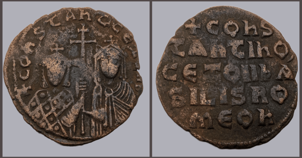 SB 75 Justin I, 512-518AD, Bronze Pentanummium, Constantinople Mint, DN IVSTINVS PP AVG, Large chi-rho, officina letter to left, value letter epsilon (5) to rightSB 62 Justin I, 518-527AD, Bronze AE2, Constantinople Mint, DN IVSTINVS PP AVG, Large M, star left, cross above, star right, CON mint mark belowSB 159 Justinian I, 527-538AD, AE Follis(40 nummi), Constantinople mint, 3rd officina, D N IVSTINIANVS P P AVG, Large M, star to left, cross above and to right, officina letter beneath, CON in exergueSB 199 Justinian I, 527-538AD, AE Follis, Nicomedia mint 2nd officina, Diademed, draped, cuirassed bust right, D N IVSTINIANVS P P AVG, Large M, cross on either side and above, officina letter(B) beneath, NIKM in exergue.SB 224A Justinian I, 527-528AD, AE Half Follis, Antioch mint 3rd officina, Diademed, draped, cuirassed bust right, D N IVSTINIANVS P P AVG, Large K, long cross to left dividing A-N above and T-X bellow, Γ to right, ANTX K Γ, 9.52g, 26.4mmSB 361 MIB 44a Justin II, 574-575AD, AE Half Follis, Constantinople mint 3rd officina, DN IVSTINVS PP AVG, Justin left and Sophia right, seated facing on double-throne, both nimbate, Justin holding cross on globe, Sophia holding sceptre topped by cross, Large K, ANNO to left, cross above, regnal year to right, officina letter below. 7.0g 25.7mmSB 537 MIB 102C Maurice Tiberius, 595-596AD, AE Decanummium, Antioch mint, D N MAV CN P AV, crowned and mantled bust facing, trefoil or \|/ pattern on crown, holding mappa and eagle-tipped sceptre, Large I, cross on top, ANNO to left, regnal year, XIIII, to right, THEUP, 2.66g, 18.0mmSB 644 Phocas, 602-610AD, AE Half Follis, Constantinople mint 4th officina, Overstruck, “PP AVG” visible on obverse, Crowned and mantled bust facing, holding mappa and cross, DM FOCA PERP AVG, Large XX, star above. Mintmark CONΔMIB 83a; DOC 87; SB 671. Phocas, 605-606AD, AE Follis, Antioch mint, O N FOCA NЄ PЄ AV, Phocas on left and Leontia on right, standing facing; he holds a globus cruciger while she holds a cruciform scepter, cross between their heads, Large M, ANNO to left, cross above, V to right, THEUP in exergue, 11.25g 28.4mmBCV 1004 Constans II Pogonatos, 644-645AD, AE Follis(40 nummi), Constantinople Mint, PER CONST, Large M, ANA to left, cross above, III to right, mint mark below, NEOS in exAnonymous A3 Follis Jesus Christ, 1025-1028AD, AE Follis, Constantinople mint, Bust of Christ facing, wearing nimbus cruciger, pallium and colobium, holding ornamented Gospels with both hands, IC to left, XC to right, +ЄMMANOVHΛ, IC XC, Legend in four lines with ornaments above and below, +IhSЧS XRISTЧS bASILЄЧ bASILЄAnonymous A3 Follis Jesus Christ, 1025-1028AD, AE Follis, Constantinople mint, Bust of Christ facing, wearing nimbus cruciger, pallium and colobium, holding ornamented Gospels with both hands, IC to left, XC to right, +ЄMMANOVHΛ, IC XC, Legend in four lines with ornaments above and below, +IhSЧS XRISTЧS bASILЄЧ bASILЄ