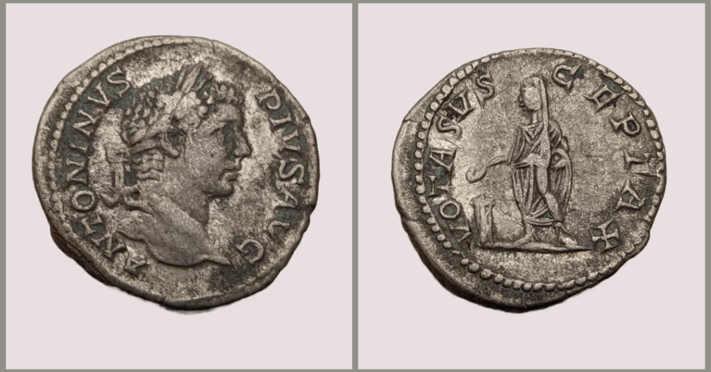RIC II Trajan 119, 103-111AD, AR Denarius, IMP TRAIANO AVG GER DAC P M TR P, Aequitas, draped, seated left on chair without back, holding scales in right hand and cornucopiae in left, COS V P P S P Q R OPTIMO PRINC, 3.23g 19.0mm RIC IV Trebonianus Gallus 48A, 251-253AD, AR Antoninanus, IMP CAE C VIB TREB GALLVS AVG, Victory, winged, draped, standing left, holding wreath in right hand and palm in left hand, VICTORIA AVGG, 3.41g 22.4mmRIC II Vespasian 703, 74AD, AR Denarius, IMP CAESAR VESPASIANVS AVG, Winged caduceus, upright, PON MAX TR P COS V, 2.75g, 18.8mmRIC II Titus 124, 80AD, AR Denarius, IMP TITVS CAES VESPASIAN AVG P M, Square seat draped, three crescents in triangular frame with palmettes or corn-ears or both, TR P IX IMP XV COS VIII P P, 2.81g, 18.2mmRIC II Domitian 28 or 58, 81AD, AR Denarius, IMP CAES DOMITIANVS AVG P M. A very rare coin, minted during the first 4 months of Domitian’s reign, Sept 14-Dec 31 81AD, Minerva advancing right, holding spear and shield, [TR P?] COS VII DES VIII P P, The only difference between the references is the inclusion of “TR P” on the reverse, sadly I cannot determine which fits this coin, 2.66g, 18.7mmRIC II Domitian 735, 92AD, AR Denarius, IMP CAES DOMIT AVG GERM P M TR P XI, Minerva advancing right, holding spear and shield, IMP XXII COS XVI CENS P P P, Minerva was Domitian’s favorite deity, representing his moral and religious reforms, a break from the themes of the past that depicted military triumph and strength, 3.09g, 18.2mmRIC II Trajan 343, 114-117AD, AR Denarius, IMP CAES NER TRAIANO OPTIMO AVG GER DAC, Felicitas, draped, standing left, holding up caduceus in right hand and cornucopiae in left, P M TR P COS VI P P S P Q R, 3.16g, 18.4mmRIC III Antoninus Pius 417A, 140AD, AR Denarius, ANTONINVS AVG PIVS P P TR P COS III, Marcus Aurelius as Caesar, AVRELIVS CAESAR AVG PII F COS, 3.17g, 16.5mm, SOLDRIC IV Geta 20B, 200-202AD, AR Denarius, P SEPT GETA CAES PONT, Securitas, draped, seated left, holding globe in right hand, left arm resting on arm of chair, SECVRIT IMPERII, 1.94g, 17.3mmRIC IV Geta 23 Limes, 200-202AD, AE Limes Denarius, P SEPT GETA CAES PONT, Victory, winged, draped, flying left, holding ribbon in both hands over shield on low base, VICT AETERN, 2.58g, 18.3mmGeta/Caracalla Contemporary Fouree, 198-210AD, Silver plated AE, Head of Geta, This coin features an obverse/reverse mismatch, the victory reverse was used on coins of Caracalla, 1.31g, 16.5mmRIC IV Caracalla 9, 196-198AD, AR Denarius, M AVR ANTON CAES PONTIF, Felicitas, draped, standing left, holding caduceus in right hand and child in left arm, IMPERII FELICITAS, 2.23g, 17.9mmRIC IV Caracalla 179, 206-210AD, AR Denarius, ANTONINVS PIVS AVG, Caracalla, veiled, togate, standing left, sacrificing out of patera in right hand over tripod and holding roll in left hand, VOTA SVSCEPTA X, 3.00g, 19.2mmRIC IV Caracalla 206a, 213AD, AR Denarius, ANTONINVS PIVS AVG BRIT, Hercules naked except for lion-skin, holding branch and club. P M TR P XVI COS IIII P P, 3.32g, 18.4mmRIC IV Caracalla 206c, 213AD, AR Denarius, ANTONINVS PIVS AVG GERM, Hercules naked except for lion-skin, holding branch and club. P M TR P XVI COS IIII P P, 2.77g, 19.44mmRIC IV Elagabalus 72e, 218-222AD, AR Antoninianus, IMP ANTONINVS AVG, Fides, draped, standing front, head right, holding standard in left hand and vexillum in right hand, FIDES MILITVM, 4.66g, 22.9mmRIC IV Severus Alexander 301, 222-235AD, AR Denarius, Antioch Mint, IMP C M AVR SEV ALEXAND AVG, Victory, winged, draped, running right, holding wreath in right hand and palm in left hand; in field, star, VICTORIA AVG, 2.83g, 18.9mmRIC IV Gordian III 140, 243-244AD, AR Antoninianus, IMP GORDIANVS PIVS FEL AVG, Felicitas, draped, standing left, holding long caduceus in right hand and cornucopiae, FELICIT TEMP. 3.74g, 22.7mmRIC IV Philip I 40B, 244-247AD, AR Antoninianus,IMP M IVL PHILIPPVS AVG, Pax, draped, standing left, holding branch in right hand and transverse spear in left hand, PAX AETERNRIC V Valerian 106, 257AD, AR Antoninianus, IMP C P LIC VALERIANVS P F AVG, Sol, radiate, standing or walking left, raising right hand and holding whip or globe in left hand, ORIENS AVGG, SOLDRIC V Gallienus 260k: Subtype 1, 260-268AD, Billon Antoninianus, GALLIENVS AVG, Pax, draped, seated left, holding olive-branch in right hand and sceptre in left hand, PAX PVBLICARIC V Gallienus 668a: Subtype 3, 260-268AD, AR Billon Antoninianus, Antioch mint, 9th emission, ex. CNG, GALLIENVS AVG, Bust of Gallienus, radiate, draped, right, VIRTVS AVG, Virtus, helmeted, in military attire, standing left, holding shield in right hand and spear in left hand, -/-//*, 4.43g, 21.9mm RIC V Salonina (2) 71, 260-268AD, Billon Antoninianus, SALONINA AVG, Concordia, draped, seated left, holding patera in right hand and double cornucopiae in left hand,CONCOR AVG, /-//IIRIC V Postumus 83, 260-269AD, AR Antoninianus, Lugdunum Mint, IMP C POSTVMVS P F AVG, Postumus, draped, cuirassed, standing right, holding spear in right hand and globe in left hand, SAECVLI FELICITAS, 3.36g, 19.9mmRIC V Victorinus 61, 269-271AD, AR Antoninianus, Southern Gallic Mint, IMP C VICTORINVS P F AVG, Providentia, draped, standing left, holding baton in right hand and sceptre in left hand; at foot, globe, PROVID AVG or PROVIDENTIA AVGRIC V Claudius Gothicus 14, 268-270AD, Billon Antoninianus, Rome Mint, IMP C CLAVDIVS AVG, Aequitas, draped, standing left, holding scales in right hand and cornucopiae in left hand, AEQVITAS AVGRIC V Claudius Gothicus 214, 268-270AD, Billon Antoninianus, Antioch Mint, IMP C CLAVDIVS AVG, Neptune, standing left, holding dolphin in right hand and trident in left hand, NEPTVN AVG or NEPTVS AVG, /-//A, SOLDRIC V Tetricus I 271 Tetricus II, 273-274AD, Billon Antoninianus, Cologne Mint, C P ES TETRICVS CAES or C P ESV TETRICVS CAES or C E P TETRICVS CAES or C TETRICVS CAES, Spes, draped, walking left, holding flower in right hand and raising robe with left hand, SPES AVGGRIC V
