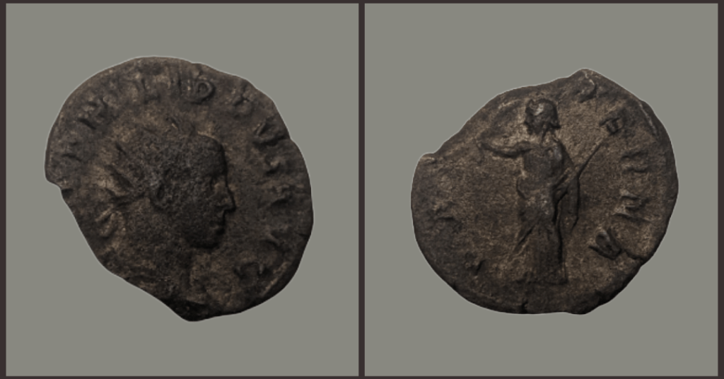 RIC II Trajan 119, 103-111AD, AR Denarius, IMP TRAIANO AVG GER DAC P M TR P, Aequitas, draped, seated left on chair without back, holding scales in right hand and cornucopiae in left, COS V P P S P Q R OPTIMO PRINC, 3.23g 19.0mm RIC IV Trebonianus Gallus 48A, 251-253AD, AR Antoninanus, IMP CAE C VIB TREB GALLVS AVG, Victory, winged, draped, standing left, holding wreath in right hand and palm in left hand, VICTORIA AVGG, 3.41g 22.4mmRIC II Vespasian 703, 74AD, AR Denarius, IMP CAESAR VESPASIANVS AVG, Winged caduceus, upright, PON MAX TR P COS V, 2.75g, 18.8mmRIC II Titus 124, 80AD, AR Denarius, IMP TITVS CAES VESPASIAN AVG P M, Square seat draped, three crescents in triangular frame with palmettes or corn-ears or both, TR P IX IMP XV COS VIII P P, 2.81g, 18.2mmRIC II Domitian 28 or 58, 81AD, AR Denarius, IMP CAES DOMITIANVS AVG P M. A very rare coin, minted during the first 4 months of Domitian’s reign, Sept 14-Dec 31 81AD, Minerva advancing right, holding spear and shield, [TR P?] COS VII DES VIII P P, The only difference between the references is the inclusion of “TR P” on the reverse, sadly I cannot determine which fits this coin, 2.66g, 18.7mmRIC II Domitian 735, 92AD, AR Denarius, IMP CAES DOMIT AVG GERM P M TR P XI, Minerva advancing right, holding spear and shield, IMP XXII COS XVI CENS P P P, Minerva was Domitian’s favorite deity, representing his moral and religious reforms, a break from the themes of the past that depicted military triumph and strength, 3.09g, 18.2mmRIC II Trajan 343, 114-117AD, AR Denarius, IMP CAES NER TRAIANO OPTIMO AVG GER DAC, Felicitas, draped, standing left, holding up caduceus in right hand and cornucopiae in left, P M TR P COS VI P P S P Q R, 3.16g, 18.4mmRIC III Antoninus Pius 417A, 140AD, AR Denarius, ANTONINVS AVG PIVS P P TR P COS III, Marcus Aurelius as Caesar, AVRELIVS CAESAR AVG PII F COS, 3.17g, 16.5mm, SOLDRIC IV Geta 20B, 200-202AD, AR Denarius, P SEPT GETA CAES PONT, Securitas, draped, seated left, holding globe in right hand, left arm resting on arm of chair, SECVRIT IMPERII, 1.94g, 17.3mmRIC IV Geta 23 Limes, 200-202AD, AE Limes Denarius, P SEPT GETA CAES PONT, Victory, winged, draped, flying left, holding ribbon in both hands over shield on low base, VICT AETERN, 2.58g, 18.3mmGeta/Caracalla Contemporary Fouree, 198-210AD, Silver plated AE, Head of Geta, This coin features an obverse/reverse mismatch, the victory reverse was used on coins of Caracalla, 1.31g, 16.5mmRIC IV Caracalla 9, 196-198AD, AR Denarius, M AVR ANTON CAES PONTIF, Felicitas, draped, standing left, holding caduceus in right hand and child in left arm, IMPERII FELICITAS, 2.23g, 17.9mmRIC IV Caracalla 179, 206-210AD, AR Denarius, ANTONINVS PIVS AVG, Caracalla, veiled, togate, standing left, sacrificing out of patera in right hand over tripod and holding roll in left hand, VOTA SVSCEPTA X, 3.00g, 19.2mmRIC IV Caracalla 206a, 213AD, AR Denarius, ANTONINVS PIVS AVG BRIT, Hercules naked except for lion-skin, holding branch and club. P M TR P XVI COS IIII P P, 3.32g, 18.4mmRIC IV Caracalla 206c, 213AD, AR Denarius, ANTONINVS PIVS AVG GERM, Hercules naked except for lion-skin, holding branch and club. P M TR P XVI COS IIII P P, 2.77g, 19.44mmRIC IV Elagabalus 72e, 218-222AD, AR Antoninianus, IMP ANTONINVS AVG, Fides, draped, standing front, head right, holding standard in left hand and vexillum in right hand, FIDES MILITVM, 4.66g, 22.9mmRIC IV Severus Alexander 301, 222-235AD, AR Denarius, Antioch Mint, IMP C M AVR SEV ALEXAND AVG, Victory, winged, draped, running right, holding wreath in right hand and palm in left hand; in field, star, VICTORIA AVG, 2.83g, 18.9mmRIC IV Gordian III 140, 243-244AD, AR Antoninianus, IMP GORDIANVS PIVS FEL AVG, Felicitas, draped, standing left, holding long caduceus in right hand and cornucopiae, FELICIT TEMP. 3.74g, 22.7mmRIC IV Philip I 40B, 244-247AD, AR Antoninianus,IMP M IVL PHILIPPVS AVG, Pax, draped, standing left, holding branch in right hand and transverse spear in left hand, PAX AETERNRIC V Valerian 106, 257AD, AR Antoninianus, IMP C P LIC VALERIANVS P F AVG, Sol, radiate, standing or walking left, raising right hand and holding whip or globe in left hand, ORIENS AVGG, SOLDRIC V Gallienus 260k: Subtype 1, 260-268AD, Billon Antoninianus, GALLIENVS AVG, Pax, draped, seated left, holding olive-branch in right hand and sceptre in left hand, PAX PVBLICARIC V Gallienus 668a: Subtype 3, 260-268AD, AR Billon Antoninianus, Antioch mint, 9th emission, ex. CNG, GALLIENVS AVG, Bust of Gallienus, radiate, draped, right, VIRTVS AVG, Virtus, helmeted, in military attire, standing left, holding shield in right hand and spear in left hand, -/-//*, 4.43g, 21.9mm RIC V Salonina (2) 71, 260-268AD, Billon Antoninianus, SALONINA AVG, Concordia, draped, seated left, holding patera in right hand and double cornucopiae in left hand,CONCOR AVG, /-//IIRIC V Postumus 83, 260-269AD, AR Antoninianus, Lugdunum Mint, IMP C POSTVMVS P F AVG, Postumus, draped, cuirassed, standing right, holding spear in right hand and globe in left hand, SAECVLI FELICITAS, 3.36g, 19.9mmRIC V Victorinus 61, 269-271AD, AR Antoninianus, Southern Gallic Mint, IMP C VICTORINVS P F AVG, Providentia, draped, standing left, holding baton in right hand and sceptre in left hand; at foot, globe, PROVID AVG or PROVIDENTIA AVGRIC V Claudius Gothicus 14, 268-270AD, Billon Antoninianus, Rome Mint, IMP C CLAVDIVS AVG, Aequitas, draped, standing left, holding scales in right hand and cornucopiae in left hand, AEQVITAS AVGRIC V Claudius Gothicus 214, 268-270AD, Billon Antoninianus, Antioch Mint, IMP C CLAVDIVS AVG, Neptune, standing left, holding dolphin in right hand and trident in left hand, NEPTVN AVG or NEPTVS AVG, /-//A, SOLDRIC V Tetricus I 271 Tetricus II, 273-274AD, Billon Antoninianus, Cologne Mint, C P ES TETRICVS CAES or C P ESV TETRICVS CAES or C E P TETRICVS CAES or C TETRICVS CAES, Spes, draped, walking left, holding flower in right hand and raising robe with left hand, SPES AVGGRIC V