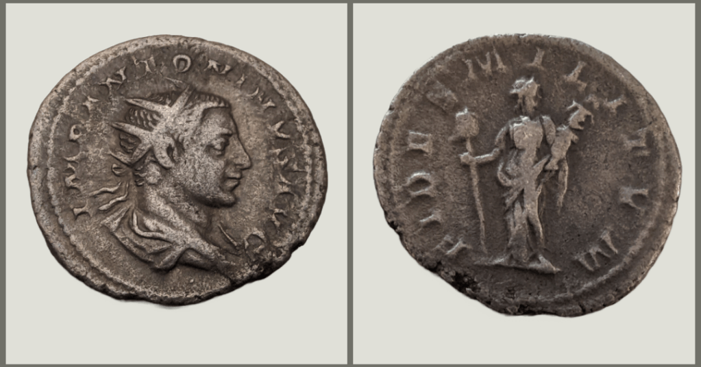 RIC II Trajan 119, 103-111AD, AR Denarius, IMP TRAIANO AVG GER DAC P M TR P, Aequitas, draped, seated left on chair without back, holding scales in right hand and cornucopiae in left, COS V P P S P Q R OPTIMO PRINC, 3.23g 19.0mm RIC IV Trebonianus Gallus 48A, 251-253AD, AR Antoninanus, IMP CAE C VIB TREB GALLVS AVG, Victory, winged, draped, standing left, holding wreath in right hand and palm in left hand, VICTORIA AVGG, 3.41g 22.4mmRIC II Vespasian 703, 74AD, AR Denarius, IMP CAESAR VESPASIANVS AVG, Winged caduceus, upright, PON MAX TR P COS V, 2.75g, 18.8mmRIC II Titus 124, 80AD, AR Denarius, IMP TITVS CAES VESPASIAN AVG P M, Square seat draped, three crescents in triangular frame with palmettes or corn-ears or both, TR P IX IMP XV COS VIII P P, 2.81g, 18.2mmRIC II Domitian 28 or 58, 81AD, AR Denarius, IMP CAES DOMITIANVS AVG P M. A very rare coin, minted during the first 4 months of Domitian’s reign, Sept 14-Dec 31 81AD, Minerva advancing right, holding spear and shield, [TR P?] COS VII DES VIII P P, The only difference between the references is the inclusion of “TR P” on the reverse, sadly I cannot determine which fits this coin, 2.66g, 18.7mmRIC II Domitian 735, 92AD, AR Denarius, IMP CAES DOMIT AVG GERM P M TR P XI, Minerva advancing right, holding spear and shield, IMP XXII COS XVI CENS P P P, Minerva was Domitian’s favorite deity, representing his moral and religious reforms, a break from the themes of the past that depicted military triumph and strength, 3.09g, 18.2mmRIC II Trajan 343, 114-117AD, AR Denarius, IMP CAES NER TRAIANO OPTIMO AVG GER DAC, Felicitas, draped, standing left, holding up caduceus in right hand and cornucopiae in left, P M TR P COS VI P P S P Q R, 3.16g, 18.4mmRIC III Antoninus Pius 417A, 140AD, AR Denarius, ANTONINVS AVG PIVS P P TR P COS III, Marcus Aurelius as Caesar, AVRELIVS CAESAR AVG PII F COS, 3.17g, 16.5mm, SOLDRIC IV Geta 20B, 200-202AD, AR Denarius, P SEPT GETA CAES PONT, Securitas, draped, seated left, holding globe in right hand, left arm resting on arm of chair, SECVRIT IMPERII, 1.94g, 17.3mmRIC IV Geta 23 Limes, 200-202AD, AE Limes Denarius, P SEPT GETA CAES PONT, Victory, winged, draped, flying left, holding ribbon in both hands over shield on low base, VICT AETERN, 2.58g, 18.3mmGeta/Caracalla Contemporary Fouree, 198-210AD, Silver plated AE, Head of Geta, This coin features an obverse/reverse mismatch, the victory reverse was used on coins of Caracalla, 1.31g, 16.5mmRIC IV Caracalla 9, 196-198AD, AR Denarius, M AVR ANTON CAES PONTIF, Felicitas, draped, standing left, holding caduceus in right hand and child in left arm, IMPERII FELICITAS, 2.23g, 17.9mmRIC IV Caracalla 179, 206-210AD, AR Denarius, ANTONINVS PIVS AVG, Caracalla, veiled, togate, standing left, sacrificing out of patera in right hand over tripod and holding roll in left hand, VOTA SVSCEPTA X, 3.00g, 19.2mmRIC IV Caracalla 206a, 213AD, AR Denarius, ANTONINVS PIVS AVG BRIT, Hercules naked except for lion-skin, holding branch and club. P M TR P XVI COS IIII P P, 3.32g, 18.4mmRIC IV Caracalla 206c, 213AD, AR Denarius, ANTONINVS PIVS AVG GERM, Hercules naked except for lion-skin, holding branch and club. P M TR P XVI COS IIII P P, 2.77g, 19.44mmRIC IV Elagabalus 72e, 218-222AD, AR Antoninianus, IMP ANTONINVS AVG, Fides, draped, standing front, head right, holding standard in left hand and vexillum in right hand, FIDES MILITVM, 4.66g, 22.9mmRIC IV Severus Alexander 301, 222-235AD, AR Denarius, Antioch Mint, IMP C M AVR SEV ALEXAND AVG, Victory, winged, draped, running right, holding wreath in right hand and palm in left hand; in field, star, VICTORIA AVG, 2.83g, 18.9mmRIC IV Gordian III 140, 243-244AD, AR Antoninianus, IMP GORDIANVS PIVS FEL AVG, Felicitas, draped, standing left, holding long caduceus in right hand and cornucopiae, FELICIT TEMP. 3.74g, 22.7mmRIC IV Philip I 40B, 244-247AD, AR Antoninianus,IMP M IVL PHILIPPVS AVG, Pax, draped, standing left, holding branch in right hand and transverse spear in left hand, PAX AETERNRIC V Valerian 106, 257AD, AR Antoninianus, IMP C P LIC VALERIANVS P F AVG, Sol, radiate, standing or walking left, raising right hand and holding whip or globe in left hand, ORIENS AVGG, SOLDRIC V Gallienus 260k: Subtype 1, 260-268AD, Billon Antoninianus, GALLIENVS AVG, Pax, draped, seated left, holding olive-branch in right hand and sceptre in left hand, PAX PVBLICARIC V Gallienus 668a: Subtype 3, 260-268AD, AR Billon Antoninianus, Antioch mint, 9th emission, ex. CNG, GALLIENVS AVG, Bust of Gallienus, radiate, draped, right, VIRTVS AVG, Virtus, helmeted, in military attire, standing left, holding shield in right hand and spear in left hand, -/-//*, 4.43g, 21.9mm RIC V Salonina (2) 71, 260-268AD, Billon Antoninianus, SALONINA AVG, Concordia, draped, seated left, holding patera in right hand and double cornucopiae in left hand,CONCOR AVG, /-//IIRIC V Postumus 83, 260-269AD, AR Antoninianus, Lugdunum Mint, IMP C POSTVMVS P F AVG, Postumus, draped, cuirassed, standing right, holding spear in right hand and globe in left hand, SAECVLI FELICITAS, 3.36g, 19.9mmRIC V Victorinus 61, 269-271AD, AR Antoninianus, Southern Gallic Mint, IMP C VICTORINVS P F AVG, Providentia, draped, standing left, holding baton in right hand and sceptre in left hand; at foot, globe, PROVID AVG or PROVIDENTIA AVGRIC V Claudius Gothicus 14, 268-270AD, Billon Antoninianus, Rome Mint, IMP C CLAVDIVS AVG, Aequitas, draped, standing left, holding scales in right hand and cornucopiae in left hand, AEQVITAS AVGRIC V Claudius Gothicus 214, 268-270AD, Billon Antoninianus, Antioch Mint, IMP C CLAVDIVS AVG, Neptune, standing left, holding dolphin in right hand and trident in left hand, NEPTVN AVG or NEPTVS AVG, /-//A, SOLDRIC V Tetricus I 271 Tetricus II, 273-274AD, Billon Antoninianus, Cologne Mint, C P ES TETRICVS CAES or C P ESV TETRICVS CAES or C E P TETRICVS CAES or C TETRICVS CAES, Spes, draped, walking left, holding flower in right hand and raising robe with left hand, SPES AVGGRIC V
