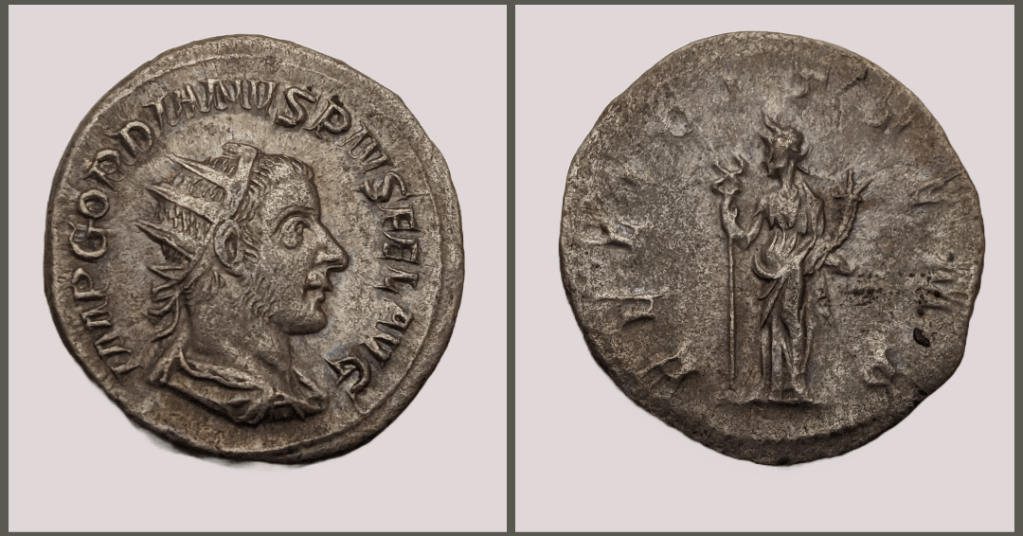 RIC II Trajan 119, 103-111AD, AR Denarius, IMP TRAIANO AVG GER DAC P M TR P, Aequitas, draped, seated left on chair without back, holding scales in right hand and cornucopiae in left, COS V P P S P Q R OPTIMO PRINC, 3.23g 19.0mm RIC IV Trebonianus Gallus 48A, 251-253AD, AR Antoninanus, IMP CAE C VIB TREB GALLVS AVG, Victory, winged, draped, standing left, holding wreath in right hand and palm in left hand, VICTORIA AVGG, 3.41g 22.4mmRIC II Vespasian 703, 74AD, AR Denarius, IMP CAESAR VESPASIANVS AVG, Winged caduceus, upright, PON MAX TR P COS V, 2.75g, 18.8mmRIC II Titus 124, 80AD, AR Denarius, IMP TITVS CAES VESPASIAN AVG P M, Square seat draped, three crescents in triangular frame with palmettes or corn-ears or both, TR P IX IMP XV COS VIII P P, 2.81g, 18.2mmRIC II Domitian 28 or 58, 81AD, AR Denarius, IMP CAES DOMITIANVS AVG P M. A very rare coin, minted during the first 4 months of Domitian’s reign, Sept 14-Dec 31 81AD, Minerva advancing right, holding spear and shield, [TR P?] COS VII DES VIII P P, The only difference between the references is the inclusion of “TR P” on the reverse, sadly I cannot determine which fits this coin, 2.66g, 18.7mmRIC II Domitian 735, 92AD, AR Denarius, IMP CAES DOMIT AVG GERM P M TR P XI, Minerva advancing right, holding spear and shield, IMP XXII COS XVI CENS P P P, Minerva was Domitian’s favorite deity, representing his moral and religious reforms, a break from the themes of the past that depicted military triumph and strength, 3.09g, 18.2mmRIC II Trajan 343, 114-117AD, AR Denarius, IMP CAES NER TRAIANO OPTIMO AVG GER DAC, Felicitas, draped, standing left, holding up caduceus in right hand and cornucopiae in left, P M TR P COS VI P P S P Q R, 3.16g, 18.4mmRIC III Antoninus Pius 417A, 140AD, AR Denarius, ANTONINVS AVG PIVS P P TR P COS III, Marcus Aurelius as Caesar, AVRELIVS CAESAR AVG PII F COS, 3.17g, 16.5mm, SOLDRIC IV Geta 20B, 200-202AD, AR Denarius, P SEPT GETA CAES PONT, Securitas, draped, seated left, holding globe in right hand, left arm resting on arm of chair, SECVRIT IMPERII, 1.94g, 17.3mmRIC IV Geta 23 Limes, 200-202AD, AE Limes Denarius, P SEPT GETA CAES PONT, Victory, winged, draped, flying left, holding ribbon in both hands over shield on low base, VICT AETERN, 2.58g, 18.3mmGeta/Caracalla Contemporary Fouree, 198-210AD, Silver plated AE, Head of Geta, This coin features an obverse/reverse mismatch, the victory reverse was used on coins of Caracalla, 1.31g, 16.5mmRIC IV Caracalla 9, 196-198AD, AR Denarius, M AVR ANTON CAES PONTIF, Felicitas, draped, standing left, holding caduceus in right hand and child in left arm, IMPERII FELICITAS, 2.23g, 17.9mmRIC IV Caracalla 179, 206-210AD, AR Denarius, ANTONINVS PIVS AVG, Caracalla, veiled, togate, standing left, sacrificing out of patera in right hand over tripod and holding roll in left hand, VOTA SVSCEPTA X, 3.00g, 19.2mmRIC IV Caracalla 206a, 213AD, AR Denarius, ANTONINVS PIVS AVG BRIT, Hercules naked except for lion-skin, holding branch and club. P M TR P XVI COS IIII P P, 3.32g, 18.4mmRIC IV Caracalla 206c, 213AD, AR Denarius, ANTONINVS PIVS AVG GERM, Hercules naked except for lion-skin, holding branch and club. P M TR P XVI COS IIII P P, 2.77g, 19.44mmRIC IV Elagabalus 72e, 218-222AD, AR Antoninianus, IMP ANTONINVS AVG, Fides, draped, standing front, head right, holding standard in left hand and vexillum in right hand, FIDES MILITVM, 4.66g, 22.9mmRIC IV Severus Alexander 301, 222-235AD, AR Denarius, Antioch Mint, IMP C M AVR SEV ALEXAND AVG, Victory, winged, draped, running right, holding wreath in right hand and palm in left hand; in field, star, VICTORIA AVG, 2.83g, 18.9mmRIC IV Gordian III 140, 243-244AD, AR Antoninianus, IMP GORDIANVS PIVS FEL AVG, Felicitas, draped, standing left, holding long caduceus in right hand and cornucopiae, FELICIT TEMP. 3.74g, 22.7mmRIC IV Philip I 40B, 244-247AD, AR Antoninianus,IMP M IVL PHILIPPVS AVG, Pax, draped, standing left, holding branch in right hand and transverse spear in left hand, PAX AETERNRIC V Valerian 106, 257AD, AR Antoninianus, IMP C P LIC VALERIANVS P F AVG, Sol, radiate, standing or walking left, raising right hand and holding whip or globe in left hand, ORIENS AVGG, SOLDRIC V Gallienus 260k: Subtype 1, 260-268AD, Billon Antoninianus, GALLIENVS AVG, Pax, draped, seated left, holding olive-branch in right hand and sceptre in left hand, PAX PVBLICARIC V Gallienus 668a: Subtype 3, 260-268AD, AR Billon Antoninianus, Antioch mint, 9th emission, ex. CNG, GALLIENVS AVG, Bust of Gallienus, radiate, draped, right, VIRTVS AVG, Virtus, helmeted, in military attire, standing left, holding shield in right hand and spear in left hand, -/-//*, 4.43g, 21.9mm RIC V Salonina (2) 71, 260-268AD, Billon Antoninianus, SALONINA AVG, Concordia, draped, seated left, holding patera in right hand and double cornucopiae in left hand,CONCOR AVG, /-//IIRIC V Postumus 83, 260-269AD, AR Antoninianus, Lugdunum Mint, IMP C POSTVMVS P F AVG, Postumus, draped, cuirassed, standing right, holding spear in right hand and globe in left hand, SAECVLI FELICITAS, 3.36g, 19.9mmRIC V Victorinus 61, 269-271AD, AR Antoninianus, Southern Gallic Mint, IMP C VICTORINVS P F AVG, Providentia, draped, standing left, holding baton in right hand and sceptre in left hand; at foot, globe, PROVID AVG or PROVIDENTIA AVGRIC V Claudius Gothicus 14, 268-270AD, Billon Antoninianus, Rome Mint, IMP C CLAVDIVS AVG, Aequitas, draped, standing left, holding scales in right hand and cornucopiae in left hand, AEQVITAS AVGRIC V Claudius Gothicus 214, 268-270AD, Billon Antoninianus, Antioch Mint, IMP C CLAVDIVS AVG, Neptune, standing left, holding dolphin in right hand and trident in left hand, NEPTVN AVG or NEPTVS AVG, /-//A, SOLDRIC V Tetricus I 271 Tetricus II, 273-274AD, Billon Antoninianus, Cologne Mint, C P ES TETRICVS CAES or C P ESV TETRICVS CAES or C E P TETRICVS CAES or C TETRICVS CAES, Spes, draped, walking left, holding flower in right hand and raising robe with left hand, SPES AVGGRIC V