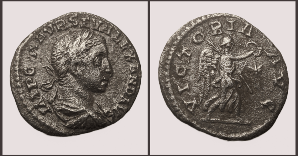 RIC II Trajan 119, 103-111AD, AR Denarius, IMP TRAIANO AVG GER DAC P M TR P, Aequitas, draped, seated left on chair without back, holding scales in right hand and cornucopiae in left, COS V P P S P Q R OPTIMO PRINC, 3.23g 19.0mm RIC IV Trebonianus Gallus 48A, 251-253AD, AR Antoninanus, IMP CAE C VIB TREB GALLVS AVG, Victory, winged, draped, standing left, holding wreath in right hand and palm in left hand, VICTORIA AVGG, 3.41g 22.4mmRIC II Vespasian 703, 74AD, AR Denarius, IMP CAESAR VESPASIANVS AVG, Winged caduceus, upright, PON MAX TR P COS V, 2.75g, 18.8mmRIC II Titus 124, 80AD, AR Denarius, IMP TITVS CAES VESPASIAN AVG P M, Square seat draped, three crescents in triangular frame with palmettes or corn-ears or both, TR P IX IMP XV COS VIII P P, 2.81g, 18.2mmRIC II Domitian 28 or 58, 81AD, AR Denarius, IMP CAES DOMITIANVS AVG P M. A very rare coin, minted during the first 4 months of Domitian’s reign, Sept 14-Dec 31 81AD, Minerva advancing right, holding spear and shield, [TR P?] COS VII DES VIII P P, The only difference between the references is the inclusion of “TR P” on the reverse, sadly I cannot determine which fits this coin, 2.66g, 18.7mmRIC II Domitian 735, 92AD, AR Denarius, IMP CAES DOMIT AVG GERM P M TR P XI, Minerva advancing right, holding spear and shield, IMP XXII COS XVI CENS P P P, Minerva was Domitian’s favorite deity, representing his moral and religious reforms, a break from the themes of the past that depicted military triumph and strength, 3.09g, 18.2mmRIC II Trajan 343, 114-117AD, AR Denarius, IMP CAES NER TRAIANO OPTIMO AVG GER DAC, Felicitas, draped, standing left, holding up caduceus in right hand and cornucopiae in left, P M TR P COS VI P P S P Q R, 3.16g, 18.4mmRIC III Antoninus Pius 417A, 140AD, AR Denarius, ANTONINVS AVG PIVS P P TR P COS III, Marcus Aurelius as Caesar, AVRELIVS CAESAR AVG PII F COS, 3.17g, 16.5mm, SOLDRIC IV Geta 20B, 200-202AD, AR Denarius, P SEPT GETA CAES PONT, Securitas, draped, seated left, holding globe in right hand, left arm resting on arm of chair, SECVRIT IMPERII, 1.94g, 17.3mmRIC IV Geta 23 Limes, 200-202AD, AE Limes Denarius, P SEPT GETA CAES PONT, Victory, winged, draped, flying left, holding ribbon in both hands over shield on low base, VICT AETERN, 2.58g, 18.3mmGeta/Caracalla Contemporary Fouree, 198-210AD, Silver plated AE, Head of Geta, This coin features an obverse/reverse mismatch, the victory reverse was used on coins of Caracalla, 1.31g, 16.5mmRIC IV Caracalla 9, 196-198AD, AR Denarius, M AVR ANTON CAES PONTIF, Felicitas, draped, standing left, holding caduceus in right hand and child in left arm, IMPERII FELICITAS, 2.23g, 17.9mmRIC IV Caracalla 179, 206-210AD, AR Denarius, ANTONINVS PIVS AVG, Caracalla, veiled, togate, standing left, sacrificing out of patera in right hand over tripod and holding roll in left hand, VOTA SVSCEPTA X, 3.00g, 19.2mmRIC IV Caracalla 206a, 213AD, AR Denarius, ANTONINVS PIVS AVG BRIT, Hercules naked except for lion-skin, holding branch and club. P M TR P XVI COS IIII P P, 3.32g, 18.4mmRIC IV Caracalla 206c, 213AD, AR Denarius, ANTONINVS PIVS AVG GERM, Hercules naked except for lion-skin, holding branch and club. P M TR P XVI COS IIII P P, 2.77g, 19.44mmRIC IV Elagabalus 72e, 218-222AD, AR Antoninianus, IMP ANTONINVS AVG, Fides, draped, standing front, head right, holding standard in left hand and vexillum in right hand, FIDES MILITVM, 4.66g, 22.9mmRIC IV Severus Alexander 301, 222-235AD, AR Denarius, Antioch Mint, IMP C M AVR SEV ALEXAND AVG, Victory, winged, draped, running right, holding wreath in right hand and palm in left hand; in field, star, VICTORIA AVG, 2.83g, 18.9mmRIC IV Gordian III 140, 243-244AD, AR Antoninianus, IMP GORDIANVS PIVS FEL AVG, Felicitas, draped, standing left, holding long caduceus in right hand and cornucopiae, FELICIT TEMP. 3.74g, 22.7mmRIC IV Philip I 40B, 244-247AD, AR Antoninianus,IMP M IVL PHILIPPVS AVG, Pax, draped, standing left, holding branch in right hand and transverse spear in left hand, PAX AETERNRIC V Valerian 106, 257AD, AR Antoninianus, IMP C P LIC VALERIANVS P F AVG, Sol, radiate, standing or walking left, raising right hand and holding whip or globe in left hand, ORIENS AVGG, SOLDRIC V Gallienus 260k: Subtype 1, 260-268AD, Billon Antoninianus, GALLIENVS AVG, Pax, draped, seated left, holding olive-branch in right hand and sceptre in left hand, PAX PVBLICARIC V Gallienus 668a: Subtype 3, 260-268AD, AR Billon Antoninianus, Antioch mint, 9th emission, ex. CNG, GALLIENVS AVG, Bust of Gallienus, radiate, draped, right, VIRTVS AVG, Virtus, helmeted, in military attire, standing left, holding shield in right hand and spear in left hand, -/-//*, 4.43g, 21.9mm RIC V Salonina (2) 71, 260-268AD, Billon Antoninianus, SALONINA AVG, Concordia, draped, seated left, holding patera in right hand and double cornucopiae in left hand,CONCOR AVG, /-//IIRIC V Postumus 83, 260-269AD, AR Antoninianus, Lugdunum Mint, IMP C POSTVMVS P F AVG, Postumus, draped, cuirassed, standing right, holding spear in right hand and globe in left hand, SAECVLI FELICITAS, 3.36g, 19.9mmRIC V Victorinus 61, 269-271AD, AR Antoninianus, Southern Gallic Mint, IMP C VICTORINVS P F AVG, Providentia, draped, standing left, holding baton in right hand and sceptre in left hand; at foot, globe, PROVID AVG or PROVIDENTIA AVGRIC V Claudius Gothicus 14, 268-270AD, Billon Antoninianus, Rome Mint, IMP C CLAVDIVS AVG, Aequitas, draped, standing left, holding scales in right hand and cornucopiae in left hand, AEQVITAS AVGRIC V Claudius Gothicus 214, 268-270AD, Billon Antoninianus, Antioch Mint, IMP C CLAVDIVS AVG, Neptune, standing left, holding dolphin in right hand and trident in left hand, NEPTVN AVG or NEPTVS AVG, /-//A, SOLDRIC V Tetricus I 271 Tetricus II, 273-274AD, Billon Antoninianus, Cologne Mint, C P ES TETRICVS CAES or C P ESV TETRICVS CAES or C E P TETRICVS CAES or C TETRICVS CAES, Spes, draped, walking left, holding flower in right hand and raising robe with left hand, SPES AVGGRIC V
