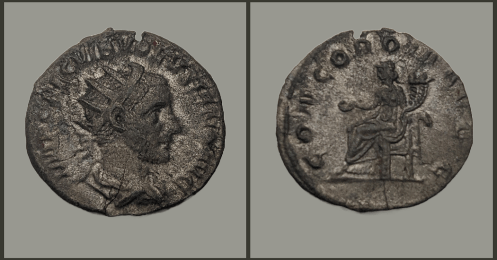 RIC II Trajan 119, 103-111AD, AR Denarius, IMP TRAIANO AVG GER DAC P M TR P, Aequitas, draped, seated left on chair without back, holding scales in right hand and cornucopiae in left, COS V P P S P Q R OPTIMO PRINC, 3.23g 19.0mm RIC IV Trebonianus Gallus 48A, 251-253AD, AR Antoninanus, IMP CAE C VIB TREB GALLVS AVG, Victory, winged, draped, standing left, holding wreath in right hand and palm in left hand, VICTORIA AVGG, 3.41g 22.4mmRIC II Vespasian 703, 74AD, AR Denarius, IMP CAESAR VESPASIANVS AVG, Winged caduceus, upright, PON MAX TR P COS V, 2.75g, 18.8mmRIC II Titus 124, 80AD, AR Denarius, IMP TITVS CAES VESPASIAN AVG P M, Square seat draped, three crescents in triangular frame with palmettes or corn-ears or both, TR P IX IMP XV COS VIII P P, 2.81g, 18.2mmRIC II Domitian 28 or 58, 81AD, AR Denarius, IMP CAES DOMITIANVS AVG P M. A very rare coin, minted during the first 4 months of Domitian’s reign, Sept 14-Dec 31 81AD, Minerva advancing right, holding spear and shield, [TR P?] COS VII DES VIII P P, The only difference between the references is the inclusion of “TR P” on the reverse, sadly I cannot determine which fits this coin, 2.66g, 18.7mmRIC II Domitian 735, 92AD, AR Denarius, IMP CAES DOMIT AVG GERM P M TR P XI, Minerva advancing right, holding spear and shield, IMP XXII COS XVI CENS P P P, Minerva was Domitian’s favorite deity, representing his moral and religious reforms, a break from the themes of the past that depicted military triumph and strength, 3.09g, 18.2mmRIC II Trajan 343, 114-117AD, AR Denarius, IMP CAES NER TRAIANO OPTIMO AVG GER DAC, Felicitas, draped, standing left, holding up caduceus in right hand and cornucopiae in left, P M TR P COS VI P P S P Q R, 3.16g, 18.4mmRIC III Antoninus Pius 417A, 140AD, AR Denarius, ANTONINVS AVG PIVS P P TR P COS III, Marcus Aurelius as Caesar, AVRELIVS CAESAR AVG PII F COS, 3.17g, 16.5mm, SOLDRIC IV Geta 20B, 200-202AD, AR Denarius, P SEPT GETA CAES PONT, Securitas, draped, seated left, holding globe in right hand, left arm resting on arm of chair, SECVRIT IMPERII, 1.94g, 17.3mmRIC IV Geta 23 Limes, 200-202AD, AE Limes Denarius, P SEPT GETA CAES PONT, Victory, winged, draped, flying left, holding ribbon in both hands over shield on low base, VICT AETERN, 2.58g, 18.3mmGeta/Caracalla Contemporary Fouree, 198-210AD, Silver plated AE, Head of Geta, This coin features an obverse/reverse mismatch, the victory reverse was used on coins of Caracalla, 1.31g, 16.5mmRIC IV Caracalla 9, 196-198AD, AR Denarius, M AVR ANTON CAES PONTIF, Felicitas, draped, standing left, holding caduceus in right hand and child in left arm, IMPERII FELICITAS, 2.23g, 17.9mmRIC IV Caracalla 179, 206-210AD, AR Denarius, ANTONINVS PIVS AVG, Caracalla, veiled, togate, standing left, sacrificing out of patera in right hand over tripod and holding roll in left hand, VOTA SVSCEPTA X, 3.00g, 19.2mmRIC IV Caracalla 206a, 213AD, AR Denarius, ANTONINVS PIVS AVG BRIT, Hercules naked except for lion-skin, holding branch and club. P M TR P XVI COS IIII P P, 3.32g, 18.4mmRIC IV Caracalla 206c, 213AD, AR Denarius, ANTONINVS PIVS AVG GERM, Hercules naked except for lion-skin, holding branch and club. P M TR P XVI COS IIII P P, 2.77g, 19.44mmRIC IV Elagabalus 72e, 218-222AD, AR Antoninianus, IMP ANTONINVS AVG, Fides, draped, standing front, head right, holding standard in left hand and vexillum in right hand, FIDES MILITVM, 4.66g, 22.9mmRIC IV Severus Alexander 301, 222-235AD, AR Denarius, Antioch Mint, IMP C M AVR SEV ALEXAND AVG, Victory, winged, draped, running right, holding wreath in right hand and palm in left hand; in field, star, VICTORIA AVG, 2.83g, 18.9mmRIC IV Gordian III 140, 243-244AD, AR Antoninianus, IMP GORDIANVS PIVS FEL AVG, Felicitas, draped, standing left, holding long caduceus in right hand and cornucopiae, FELICIT TEMP. 3.74g, 22.7mmRIC IV Philip I 40B, 244-247AD, AR Antoninianus,IMP M IVL PHILIPPVS AVG, Pax, draped, standing left, holding branch in right hand and transverse spear in left hand, PAX AETERNRIC V Valerian 106, 257AD, AR Antoninianus, IMP C P LIC VALERIANVS P F AVG, Sol, radiate, standing or walking left, raising right hand and holding whip or globe in left hand, ORIENS AVGG, SOLDRIC V Gallienus 260k: Subtype 1, 260-268AD, Billon Antoninianus, GALLIENVS AVG, Pax, draped, seated left, holding olive-branch in right hand and sceptre in left hand, PAX PVBLICARIC V Gallienus 668a: Subtype 3, 260-268AD, AR Billon Antoninianus, Antioch mint, 9th emission, ex. CNG, GALLIENVS AVG, Bust of Gallienus, radiate, draped, right, VIRTVS AVG, Virtus, helmeted, in military attire, standing left, holding shield in right hand and spear in left hand, -/-//*, 4.43g, 21.9mm RIC V Salonina (2) 71, 260-268AD, Billon Antoninianus, SALONINA AVG, Concordia, draped, seated left, holding patera in right hand and double cornucopiae in left hand,CONCOR AVG, /-//IIRIC V Postumus 83, 260-269AD, AR Antoninianus, Lugdunum Mint, IMP C POSTVMVS P F AVG, Postumus, draped, cuirassed, standing right, holding spear in right hand and globe in left hand, SAECVLI FELICITAS, 3.36g, 19.9mmRIC V Victorinus 61, 269-271AD, AR Antoninianus, Southern Gallic Mint, IMP C VICTORINVS P F AVG, Providentia, draped, standing left, holding baton in right hand and sceptre in left hand; at foot, globe, PROVID AVG or PROVIDENTIA AVGRIC V Claudius Gothicus 14, 268-270AD, Billon Antoninianus, Rome Mint, IMP C CLAVDIVS AVG, Aequitas, draped, standing left, holding scales in right hand and cornucopiae in left hand, AEQVITAS AVGRIC V Claudius Gothicus 214, 268-270AD, Billon Antoninianus, Antioch Mint, IMP C CLAVDIVS AVG, Neptune, standing left, holding dolphin in right hand and trident in left hand, NEPTVN AVG or NEPTVS AVG, /-//A, SOLDRIC V Tetricus I 271 Tetricus II, 273-274AD, Billon Antoninianus, Cologne Mint, C P ES TETRICVS CAES or C P ESV TETRICVS CAES or C E P TETRICVS CAES or C TETRICVS CAES, Spes, draped, walking left, holding flower in right hand and raising robe with left hand, SPES AVGGRIC V