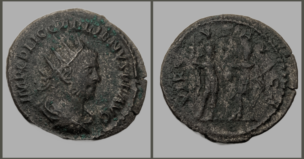 RIC II Trajan 119, 103-111AD, AR Denarius, IMP TRAIANO AVG GER DAC P M TR P, Aequitas, draped, seated left on chair without back, holding scales in right hand and cornucopiae in left, COS V P P S P Q R OPTIMO PRINC, 3.23g 19.0mm RIC IV Trebonianus Gallus 48A, 251-253AD, AR Antoninanus, IMP CAE C VIB TREB GALLVS AVG, Victory, winged, draped, standing left, holding wreath in right hand and palm in left hand, VICTORIA AVGG, 3.41g 22.4mmRIC II Vespasian 703, 74AD, AR Denarius, IMP CAESAR VESPASIANVS AVG, Winged caduceus, upright, PON MAX TR P COS V, 2.75g, 18.8mmRIC II Titus 124, 80AD, AR Denarius, IMP TITVS CAES VESPASIAN AVG P M, Square seat draped, three crescents in triangular frame with palmettes or corn-ears or both, TR P IX IMP XV COS VIII P P, 2.81g, 18.2mmRIC II Domitian 28 or 58, 81AD, AR Denarius, IMP CAES DOMITIANVS AVG P M. A very rare coin, minted during the first 4 months of Domitian’s reign, Sept 14-Dec 31 81AD, Minerva advancing right, holding spear and shield, [TR P?] COS VII DES VIII P P, The only difference between the references is the inclusion of “TR P” on the reverse, sadly I cannot determine which fits this coin, 2.66g, 18.7mmRIC II Domitian 735, 92AD, AR Denarius, IMP CAES DOMIT AVG GERM P M TR P XI, Minerva advancing right, holding spear and shield, IMP XXII COS XVI CENS P P P, Minerva was Domitian’s favorite deity, representing his moral and religious reforms, a break from the themes of the past that depicted military triumph and strength, 3.09g, 18.2mmRIC II Trajan 343, 114-117AD, AR Denarius, IMP CAES NER TRAIANO OPTIMO AVG GER DAC, Felicitas, draped, standing left, holding up caduceus in right hand and cornucopiae in left, P M TR P COS VI P P S P Q R, 3.16g, 18.4mmRIC III Antoninus Pius 417A, 140AD, AR Denarius, ANTONINVS AVG PIVS P P TR P COS III, Marcus Aurelius as Caesar, AVRELIVS CAESAR AVG PII F COS, 3.17g, 16.5mm, SOLDRIC IV Geta 20B, 200-202AD, AR Denarius, P SEPT GETA CAES PONT, Securitas, draped, seated left, holding globe in right hand, left arm resting on arm of chair, SECVRIT IMPERII, 1.94g, 17.3mmRIC IV Geta 23 Limes, 200-202AD, AE Limes Denarius, P SEPT GETA CAES PONT, Victory, winged, draped, flying left, holding ribbon in both hands over shield on low base, VICT AETERN, 2.58g, 18.3mmGeta/Caracalla Contemporary Fouree, 198-210AD, Silver plated AE, Head of Geta, This coin features an obverse/reverse mismatch, the victory reverse was used on coins of Caracalla, 1.31g, 16.5mmRIC IV Caracalla 9, 196-198AD, AR Denarius, M AVR ANTON CAES PONTIF, Felicitas, draped, standing left, holding caduceus in right hand and child in left arm, IMPERII FELICITAS, 2.23g, 17.9mmRIC IV Caracalla 179, 206-210AD, AR Denarius, ANTONINVS PIVS AVG, Caracalla, veiled, togate, standing left, sacrificing out of patera in right hand over tripod and holding roll in left hand, VOTA SVSCEPTA X, 3.00g, 19.2mmRIC IV Caracalla 206a, 213AD, AR Denarius, ANTONINVS PIVS AVG BRIT, Hercules naked except for lion-skin, holding branch and club. P M TR P XVI COS IIII P P, 3.32g, 18.4mmRIC IV Caracalla 206c, 213AD, AR Denarius, ANTONINVS PIVS AVG GERM, Hercules naked except for lion-skin, holding branch and club. P M TR P XVI COS IIII P P, 2.77g, 19.44mmRIC IV Elagabalus 72e, 218-222AD, AR Antoninianus, IMP ANTONINVS AVG, Fides, draped, standing front, head right, holding standard in left hand and vexillum in right hand, FIDES MILITVM, 4.66g, 22.9mmRIC IV Severus Alexander 301, 222-235AD, AR Denarius, Antioch Mint, IMP C M AVR SEV ALEXAND AVG, Victory, winged, draped, running right, holding wreath in right hand and palm in left hand; in field, star, VICTORIA AVG, 2.83g, 18.9mmRIC IV Gordian III 140, 243-244AD, AR Antoninianus, IMP GORDIANVS PIVS FEL AVG, Felicitas, draped, standing left, holding long caduceus in right hand and cornucopiae, FELICIT TEMP. 3.74g, 22.7mmRIC IV Philip I 40B, 244-247AD, AR Antoninianus,IMP M IVL PHILIPPVS AVG, Pax, draped, standing left, holding branch in right hand and transverse spear in left hand, PAX AETERNRIC V Valerian 106, 257AD, AR Antoninianus, IMP C P LIC VALERIANVS P F AVG, Sol, radiate, standing or walking left, raising right hand and holding whip or globe in left hand, ORIENS AVGG, SOLDRIC V Gallienus 260k: Subtype 1, 260-268AD, Billon Antoninianus, GALLIENVS AVG, Pax, draped, seated left, holding olive-branch in right hand and sceptre in left hand, PAX PVBLICARIC V Gallienus 668a: Subtype 3, 260-268AD, AR Billon Antoninianus, Antioch mint, 9th emission, ex. CNG, GALLIENVS AVG, Bust of Gallienus, radiate, draped, right, VIRTVS AVG, Virtus, helmeted, in military attire, standing left, holding shield in right hand and spear in left hand, -/-//*, 4.43g, 21.9mm RIC V Salonina (2) 71, 260-268AD, Billon Antoninianus, SALONINA AVG, Concordia, draped, seated left, holding patera in right hand and double cornucopiae in left hand,CONCOR AVG, /-//IIRIC V Postumus 83, 260-269AD, AR Antoninianus, Lugdunum Mint, IMP C POSTVMVS P F AVG, Postumus, draped, cuirassed, standing right, holding spear in right hand and globe in left hand, SAECVLI FELICITAS, 3.36g, 19.9mmRIC V Victorinus 61, 269-271AD, AR Antoninianus, Southern Gallic Mint, IMP C VICTORINVS P F AVG, Providentia, draped, standing left, holding baton in right hand and sceptre in left hand; at foot, globe, PROVID AVG or PROVIDENTIA AVGRIC V Claudius Gothicus 14, 268-270AD, Billon Antoninianus, Rome Mint, IMP C CLAVDIVS AVG, Aequitas, draped, standing left, holding scales in right hand and cornucopiae in left hand, AEQVITAS AVGRIC V Claudius Gothicus 214, 268-270AD, Billon Antoninianus, Antioch Mint, IMP C CLAVDIVS AVG, Neptune, standing left, holding dolphin in right hand and trident in left hand, NEPTVN AVG or NEPTVS AVG, /-//A, SOLDRIC V Tetricus I 271 Tetricus II, 273-274AD, Billon Antoninianus, Cologne Mint, C P ES TETRICVS CAES or C P ESV TETRICVS CAES or C E P TETRICVS CAES or C TETRICVS CAES, Spes, draped, walking left, holding flower in right hand and raising robe with left hand, SPES AVGGRIC V