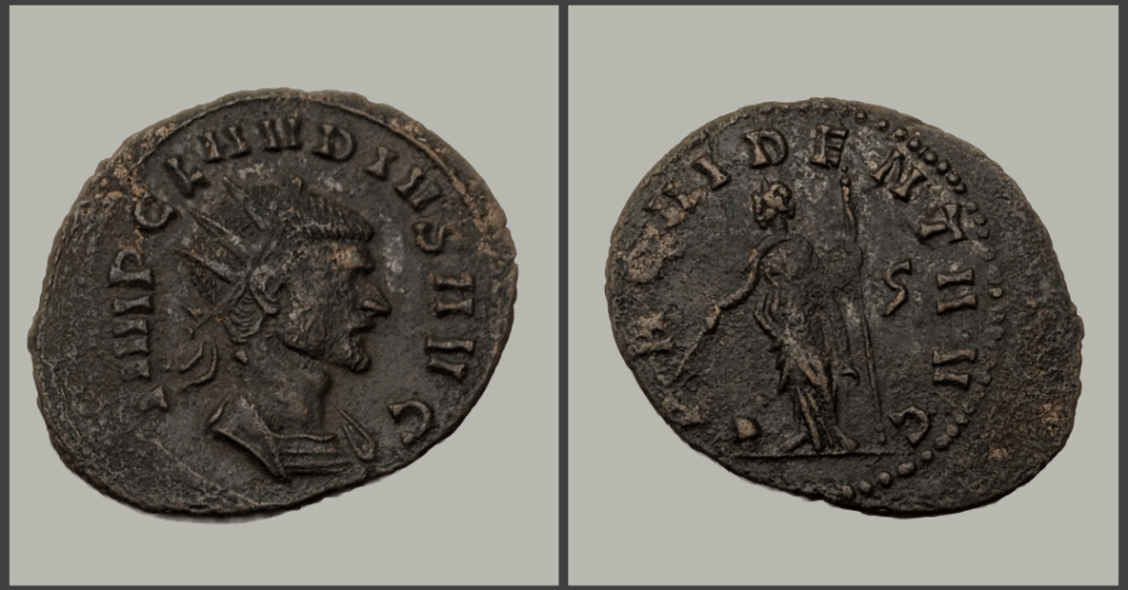 RIC II Trajan 119, 103-111AD, AR Denarius, IMP TRAIANO AVG GER DAC P M TR P, Aequitas, draped, seated left on chair without back, holding scales in right hand and cornucopiae in left, COS V P P S P Q R OPTIMO PRINC, 3.23g 19.0mm RIC IV Trebonianus Gallus 48A, 251-253AD, AR Antoninanus, IMP CAE C VIB TREB GALLVS AVG, Victory, winged, draped, standing left, holding wreath in right hand and palm in left hand, VICTORIA AVGG, 3.41g 22.4mmRIC II Vespasian 703, 74AD, AR Denarius, IMP CAESAR VESPASIANVS AVG, Winged caduceus, upright, PON MAX TR P COS V, 2.75g, 18.8mmRIC II Titus 124, 80AD, AR Denarius, IMP TITVS CAES VESPASIAN AVG P M, Square seat draped, three crescents in triangular frame with palmettes or corn-ears or both, TR P IX IMP XV COS VIII P P, 2.81g, 18.2mmRIC II Domitian 28 or 58, 81AD, AR Denarius, IMP CAES DOMITIANVS AVG P M. A very rare coin, minted during the first 4 months of Domitian’s reign, Sept 14-Dec 31 81AD, Minerva advancing right, holding spear and shield, [TR P?] COS VII DES VIII P P, The only difference between the references is the inclusion of “TR P” on the reverse, sadly I cannot determine which fits this coin, 2.66g, 18.7mmRIC II Domitian 735, 92AD, AR Denarius, IMP CAES DOMIT AVG GERM P M TR P XI, Minerva advancing right, holding spear and shield, IMP XXII COS XVI CENS P P P, Minerva was Domitian’s favorite deity, representing his moral and religious reforms, a break from the themes of the past that depicted military triumph and strength, 3.09g, 18.2mmRIC II Trajan 343, 114-117AD, AR Denarius, IMP CAES NER TRAIANO OPTIMO AVG GER DAC, Felicitas, draped, standing left, holding up caduceus in right hand and cornucopiae in left, P M TR P COS VI P P S P Q R, 3.16g, 18.4mmRIC III Antoninus Pius 417A, 140AD, AR Denarius, ANTONINVS AVG PIVS P P TR P COS III, Marcus Aurelius as Caesar, AVRELIVS CAESAR AVG PII F COS, 3.17g, 16.5mm, SOLDRIC IV Geta 20B, 200-202AD, AR Denarius, P SEPT GETA CAES PONT, Securitas, draped, seated left, holding globe in right hand, left arm resting on arm of chair, SECVRIT IMPERII, 1.94g, 17.3mmRIC IV Geta 23 Limes, 200-202AD, AE Limes Denarius, P SEPT GETA CAES PONT, Victory, winged, draped, flying left, holding ribbon in both hands over shield on low base, VICT AETERN, 2.58g, 18.3mmGeta/Caracalla Contemporary Fouree, 198-210AD, Silver plated AE, Head of Geta, This coin features an obverse/reverse mismatch, the victory reverse was used on coins of Caracalla, 1.31g, 16.5mmRIC IV Caracalla 9, 196-198AD, AR Denarius, M AVR ANTON CAES PONTIF, Felicitas, draped, standing left, holding caduceus in right hand and child in left arm, IMPERII FELICITAS, 2.23g, 17.9mmRIC IV Caracalla 179, 206-210AD, AR Denarius, ANTONINVS PIVS AVG, Caracalla, veiled, togate, standing left, sacrificing out of patera in right hand over tripod and holding roll in left hand, VOTA SVSCEPTA X, 3.00g, 19.2mmRIC IV Caracalla 206a, 213AD, AR Denarius, ANTONINVS PIVS AVG BRIT, Hercules naked except for lion-skin, holding branch and club. P M TR P XVI COS IIII P P, 3.32g, 18.4mmRIC IV Caracalla 206c, 213AD, AR Denarius, ANTONINVS PIVS AVG GERM, Hercules naked except for lion-skin, holding branch and club. P M TR P XVI COS IIII P P, 2.77g, 19.44mmRIC IV Elagabalus 72e, 218-222AD, AR Antoninianus, IMP ANTONINVS AVG, Fides, draped, standing front, head right, holding standard in left hand and vexillum in right hand, FIDES MILITVM, 4.66g, 22.9mmRIC IV Severus Alexander 301, 222-235AD, AR Denarius, Antioch Mint, IMP C M AVR SEV ALEXAND AVG, Victory, winged, draped, running right, holding wreath in right hand and palm in left hand; in field, star, VICTORIA AVG, 2.83g, 18.9mmRIC IV Gordian III 140, 243-244AD, AR Antoninianus, IMP GORDIANVS PIVS FEL AVG, Felicitas, draped, standing left, holding long caduceus in right hand and cornucopiae, FELICIT TEMP. 3.74g, 22.7mmRIC IV Philip I 40B, 244-247AD, AR Antoninianus,IMP M IVL PHILIPPVS AVG, Pax, draped, standing left, holding branch in right hand and transverse spear in left hand, PAX AETERNRIC V Valerian 106, 257AD, AR Antoninianus, IMP C P LIC VALERIANVS P F AVG, Sol, radiate, standing or walking left, raising right hand and holding whip or globe in left hand, ORIENS AVGG, SOLDRIC V Gallienus 260k: Subtype 1, 260-268AD, Billon Antoninianus, GALLIENVS AVG, Pax, draped, seated left, holding olive-branch in right hand and sceptre in left hand, PAX PVBLICARIC V Gallienus 668a: Subtype 3, 260-268AD, AR Billon Antoninianus, Antioch mint, 9th emission, ex. CNG, GALLIENVS AVG, Bust of Gallienus, radiate, draped, right, VIRTVS AVG, Virtus, helmeted, in military attire, standing left, holding shield in right hand and spear in left hand, -/-//*, 4.43g, 21.9mm RIC V Salonina (2) 71, 260-268AD, Billon Antoninianus, SALONINA AVG, Concordia, draped, seated left, holding patera in right hand and double cornucopiae in left hand,CONCOR AVG, /-//IIRIC V Postumus 83, 260-269AD, AR Antoninianus, Lugdunum Mint, IMP C POSTVMVS P F AVG, Postumus, draped, cuirassed, standing right, holding spear in right hand and globe in left hand, SAECVLI FELICITAS, 3.36g, 19.9mmRIC V Victorinus 61, 269-271AD, AR Antoninianus, Southern Gallic Mint, IMP C VICTORINVS P F AVG, Providentia, draped, standing left, holding baton in right hand and sceptre in left hand; at foot, globe, PROVID AVG or PROVIDENTIA AVGRIC V Claudius Gothicus 14, 268-270AD, Billon Antoninianus, Rome Mint, IMP C CLAVDIVS AVG, Aequitas, draped, standing left, holding scales in right hand and cornucopiae in left hand, AEQVITAS AVGRIC V Claudius Gothicus 214, 268-270AD, Billon Antoninianus, Antioch Mint, IMP C CLAVDIVS AVG, Neptune, standing left, holding dolphin in right hand and trident in left hand, NEPTVN AVG or NEPTVS AVG, /-//A, SOLDRIC V Tetricus I 271 Tetricus II, 273-274AD, Billon Antoninianus, Cologne Mint, C P ES TETRICVS CAES or C P ESV TETRICVS CAES or C E P TETRICVS CAES or C TETRICVS CAES, Spes, draped, walking left, holding flower in right hand and raising robe with left hand, SPES AVGGRIC V