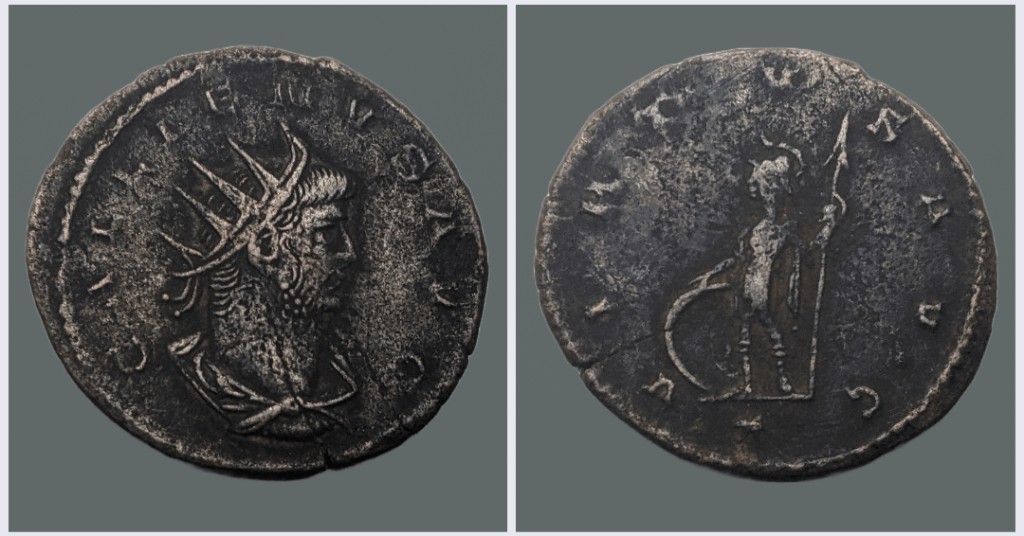 RIC II Trajan 119, 103-111AD, AR Denarius, IMP TRAIANO AVG GER DAC P M TR P, Aequitas, draped, seated left on chair without back, holding scales in right hand and cornucopiae in left, COS V P P S P Q R OPTIMO PRINC, 3.23g 19.0mm RIC IV Trebonianus Gallus 48A, 251-253AD, AR Antoninanus, IMP CAE C VIB TREB GALLVS AVG, Victory, winged, draped, standing left, holding wreath in right hand and palm in left hand, VICTORIA AVGG, 3.41g 22.4mmRIC II Vespasian 703, 74AD, AR Denarius, IMP CAESAR VESPASIANVS AVG, Winged caduceus, upright, PON MAX TR P COS V, 2.75g, 18.8mmRIC II Titus 124, 80AD, AR Denarius, IMP TITVS CAES VESPASIAN AVG P M, Square seat draped, three crescents in triangular frame with palmettes or corn-ears or both, TR P IX IMP XV COS VIII P P, 2.81g, 18.2mmRIC II Domitian 28 or 58, 81AD, AR Denarius, IMP CAES DOMITIANVS AVG P M. A very rare coin, minted during the first 4 months of Domitian’s reign, Sept 14-Dec 31 81AD, Minerva advancing right, holding spear and shield, [TR P?] COS VII DES VIII P P, The only difference between the references is the inclusion of “TR P” on the reverse, sadly I cannot determine which fits this coin, 2.66g, 18.7mmRIC II Domitian 735, 92AD, AR Denarius, IMP CAES DOMIT AVG GERM P M TR P XI, Minerva advancing right, holding spear and shield, IMP XXII COS XVI CENS P P P, Minerva was Domitian’s favorite deity, representing his moral and religious reforms, a break from the themes of the past that depicted military triumph and strength, 3.09g, 18.2mmRIC II Trajan 343, 114-117AD, AR Denarius, IMP CAES NER TRAIANO OPTIMO AVG GER DAC, Felicitas, draped, standing left, holding up caduceus in right hand and cornucopiae in left, P M TR P COS VI P P S P Q R, 3.16g, 18.4mmRIC III Antoninus Pius 417A, 140AD, AR Denarius, ANTONINVS AVG PIVS P P TR P COS III, Marcus Aurelius as Caesar, AVRELIVS CAESAR AVG PII F COS, 3.17g, 16.5mm, SOLDRIC IV Geta 20B, 200-202AD, AR Denarius, P SEPT GETA CAES PONT, Securitas, draped, seated left, holding globe in right hand, left arm resting on arm of chair, SECVRIT IMPERII, 1.94g, 17.3mmRIC IV Geta 23 Limes, 200-202AD, AE Limes Denarius, P SEPT GETA CAES PONT, Victory, winged, draped, flying left, holding ribbon in both hands over shield on low base, VICT AETERN, 2.58g, 18.3mmGeta/Caracalla Contemporary Fouree, 198-210AD, Silver plated AE, Head of Geta, This coin features an obverse/reverse mismatch, the victory reverse was used on coins of Caracalla, 1.31g, 16.5mmRIC IV Caracalla 9, 196-198AD, AR Denarius, M AVR ANTON CAES PONTIF, Felicitas, draped, standing left, holding caduceus in right hand and child in left arm, IMPERII FELICITAS, 2.23g, 17.9mmRIC IV Caracalla 179, 206-210AD, AR Denarius, ANTONINVS PIVS AVG, Caracalla, veiled, togate, standing left, sacrificing out of patera in right hand over tripod and holding roll in left hand, VOTA SVSCEPTA X, 3.00g, 19.2mmRIC IV Caracalla 206a, 213AD, AR Denarius, ANTONINVS PIVS AVG BRIT, Hercules naked except for lion-skin, holding branch and club. P M TR P XVI COS IIII P P, 3.32g, 18.4mmRIC IV Caracalla 206c, 213AD, AR Denarius, ANTONINVS PIVS AVG GERM, Hercules naked except for lion-skin, holding branch and club. P M TR P XVI COS IIII P P, 2.77g, 19.44mmRIC IV Elagabalus 72e, 218-222AD, AR Antoninianus, IMP ANTONINVS AVG, Fides, draped, standing front, head right, holding standard in left hand and vexillum in right hand, FIDES MILITVM, 4.66g, 22.9mmRIC IV Severus Alexander 301, 222-235AD, AR Denarius, Antioch Mint, IMP C M AVR SEV ALEXAND AVG, Victory, winged, draped, running right, holding wreath in right hand and palm in left hand; in field, star, VICTORIA AVG, 2.83g, 18.9mmRIC IV Gordian III 140, 243-244AD, AR Antoninianus, IMP GORDIANVS PIVS FEL AVG, Felicitas, draped, standing left, holding long caduceus in right hand and cornucopiae, FELICIT TEMP. 3.74g, 22.7mmRIC IV Philip I 40B, 244-247AD, AR Antoninianus,IMP M IVL PHILIPPVS AVG, Pax, draped, standing left, holding branch in right hand and transverse spear in left hand, PAX AETERNRIC V Valerian 106, 257AD, AR Antoninianus, IMP C P LIC VALERIANVS P F AVG, Sol, radiate, standing or walking left, raising right hand and holding whip or globe in left hand, ORIENS AVGG, SOLDRIC V Gallienus 260k: Subtype 1, 260-268AD, Billon Antoninianus, GALLIENVS AVG, Pax, draped, seated left, holding olive-branch in right hand and sceptre in left hand, PAX PVBLICARIC V Gallienus 668a: Subtype 3, 260-268AD, AR Billon Antoninianus, Antioch mint, 9th emission, ex. CNG, GALLIENVS AVG, Bust of Gallienus, radiate, draped, right, VIRTVS AVG, Virtus, helmeted, in military attire, standing left, holding shield in right hand and spear in left hand, -/-//*, 4.43g, 21.9mm RIC V Salonina (2) 71, 260-268AD, Billon Antoninianus, SALONINA AVG, Concordia, draped, seated left, holding patera in right hand and double cornucopiae in left hand,CONCOR AVG, /-//IIRIC V Postumus 83, 260-269AD, AR Antoninianus, Lugdunum Mint, IMP C POSTVMVS P F AVG, Postumus, draped, cuirassed, standing right, holding spear in right hand and globe in left hand, SAECVLI FELICITAS, 3.36g, 19.9mmRIC V Victorinus 61, 269-271AD, AR Antoninianus, Southern Gallic Mint, IMP C VICTORINVS P F AVG, Providentia, draped, standing left, holding baton in right hand and sceptre in left hand; at foot, globe, PROVID AVG or PROVIDENTIA AVGRIC V Claudius Gothicus 14, 268-270AD, Billon Antoninianus, Rome Mint, IMP C CLAVDIVS AVG, Aequitas, draped, standing left, holding scales in right hand and cornucopiae in left hand, AEQVITAS AVGRIC V Claudius Gothicus 214, 268-270AD, Billon Antoninianus, Antioch Mint, IMP C CLAVDIVS AVG, Neptune, standing left, holding dolphin in right hand and trident in left hand, NEPTVN AVG or NEPTVS AVG, /-//A, SOLDRIC V Tetricus I 271 Tetricus II, 273-274AD, Billon Antoninianus, Cologne Mint, C P ES TETRICVS CAES or C P ESV TETRICVS CAES or C E P TETRICVS CAES or C TETRICVS CAES, Spes, draped, walking left, holding flower in right hand and raising robe with left hand, SPES AVGGRIC V